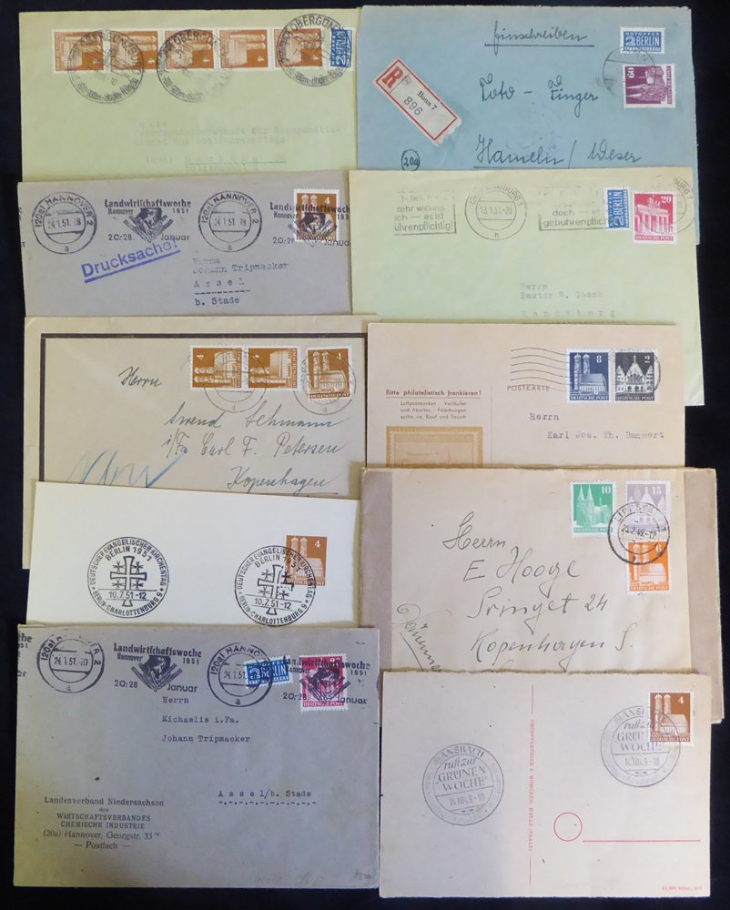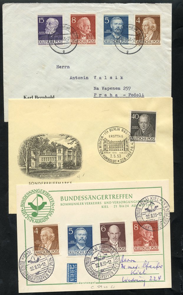 1952-53 Famous Berliners 10pf, 20pf, 40pf Mi.95, 97, 100, each on illustrated FDC's with appropriate cancellations (Cat. 146€ - Mi.2003) + 4pf, 5pf, 6pf & 8pf on a 1953 Choral Society, Kiel illustrated card & a commercial cover bearing 4pf, 5pf, 8pf & 15pf sent to Prague. (5 covers) Total (2003 Mi) Cat. 250€