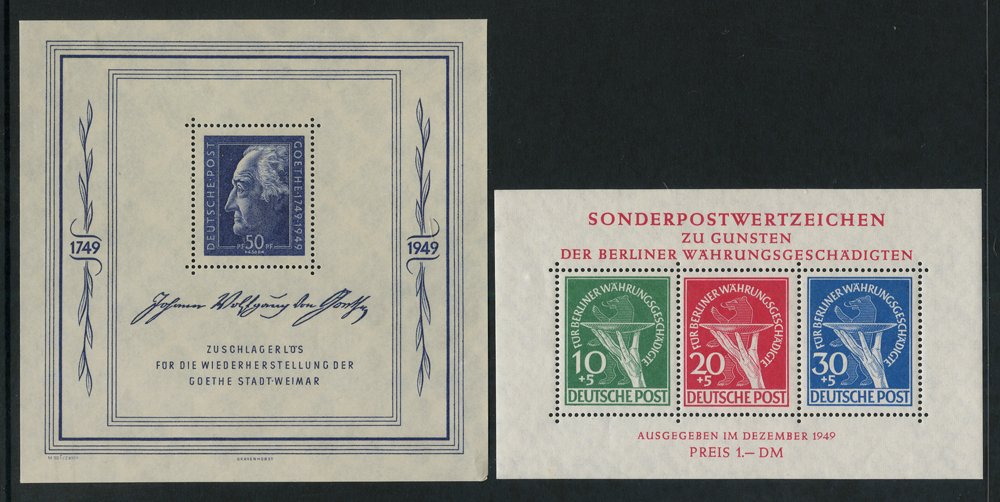 FOUR ALBUMS with M & U ranges of German States, later incl. Third Reich, Allied Occ - 1949 Goethe M/Sheet UM, East Germany, Berlin - 1949 Relief Fund M/Sheet UM (minor marginal tone), also German Colonies, Danzig, Memel, Saar etc. Nice lot with many better sets. Viewing recommended.