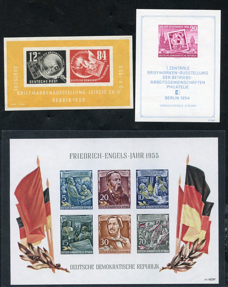 1950 Debria M/Sheet, fine M (SG.E29a), 1954 Stamp Day M/Sheet, fine M (SG.MSE200b), 1955 Engels M/Sheet (SG.233a), Cat. £350