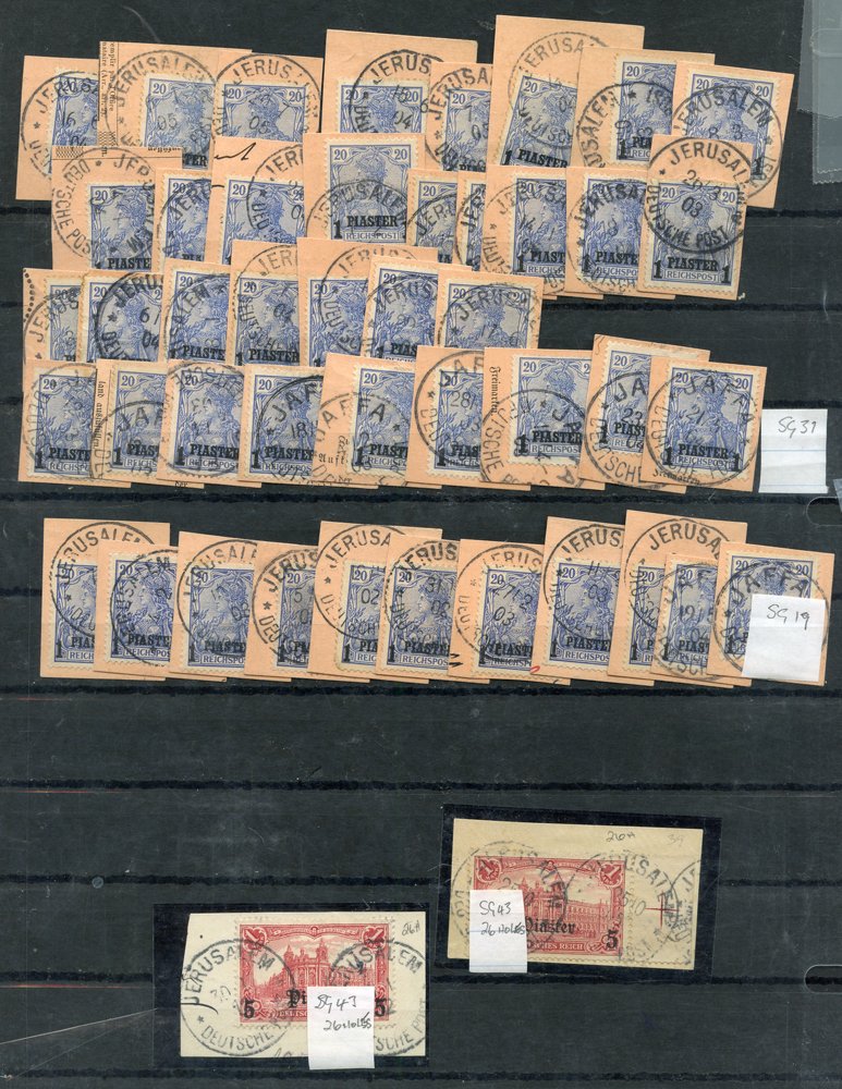 1900-05 duplicated selection being 1900 1pi on 20pf ultramarine, SG.19 (11), SG.31 (33), SG.43 (2) - all FU on piece with Jaffa or Jerusalem c.d.s's. (46) Cat. £657