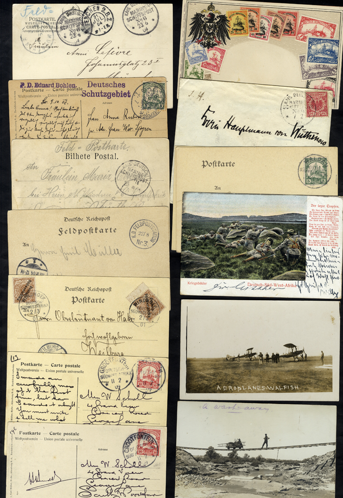 SOUTH WEST AFRICA 20thC various German Seapost cancels on postcards, carried Woermann Line Ships, vessels identified & written up, also unusually large group of postcards, Herero War views, action scenes, groups, POW's, with good postal stationery. Fine lot. (62)
