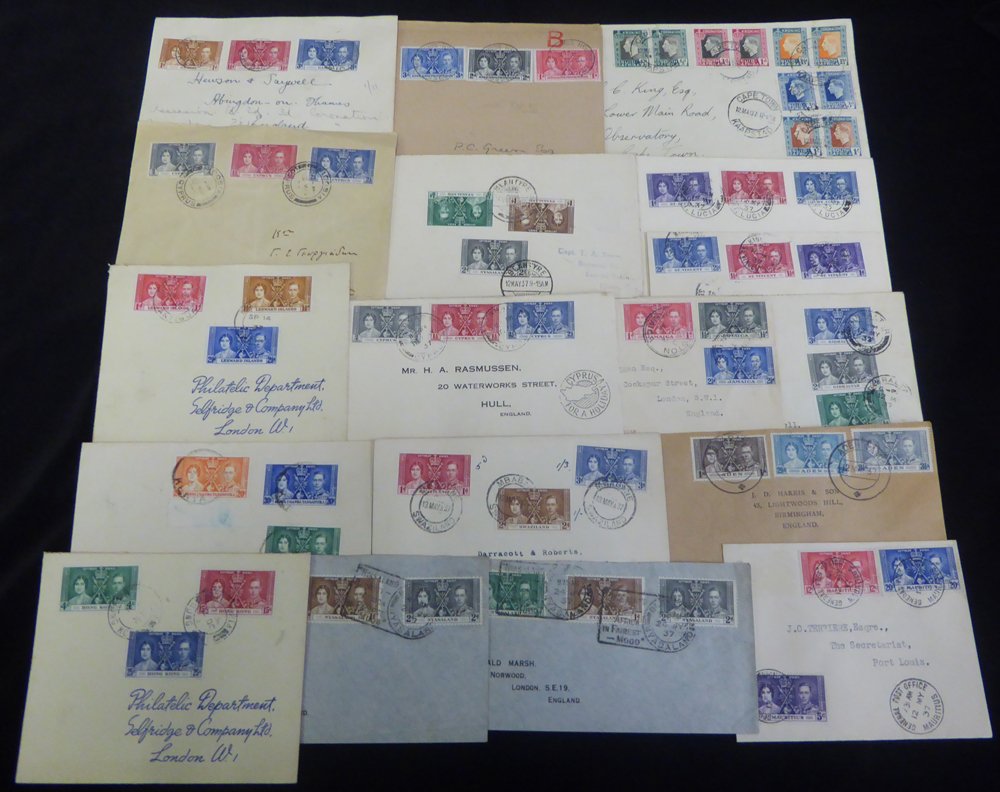 1937 Coronation covers (84) & one front, of which 64 are registered, duplication but noted include Hong Kong, Aden, Cyprus, South Africa (3). Mainly fine.