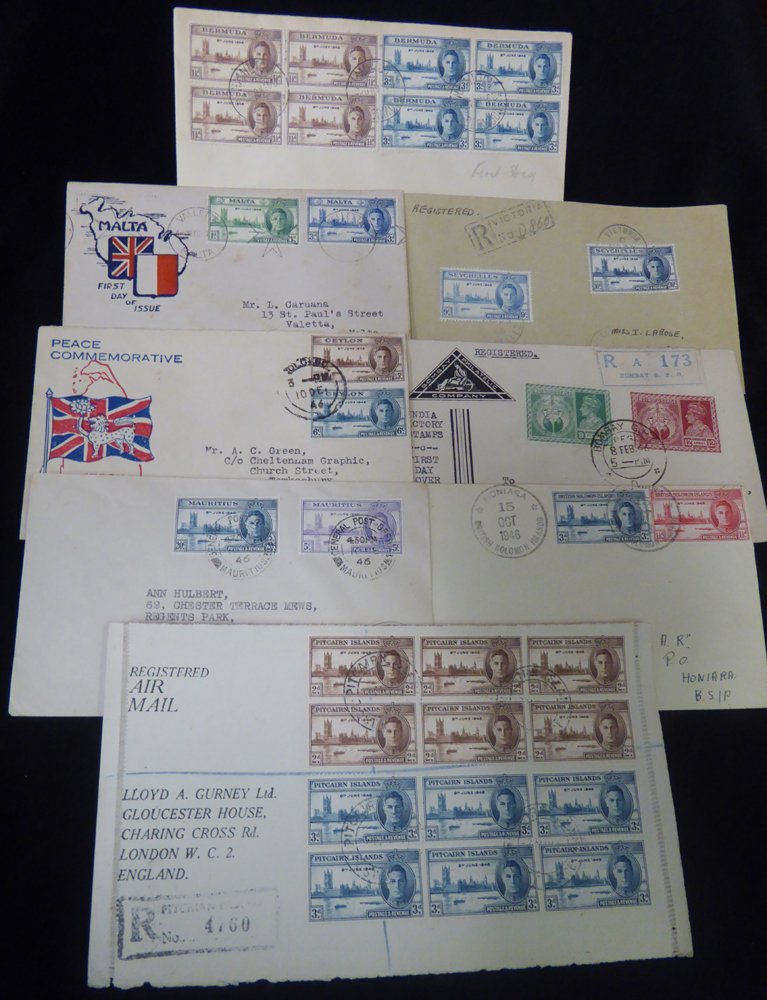 1946 Victory covers (15) & one front (Pitcairn in blocks of six) incl. Bermuda (3) - two in blocks of four, Gold Coast (2) British Guiana, British Solomon Islands, Ceylon, India, Jamaica, Mauritius, Malta (2) Northern Rhodesia and Seychelles. Mostly first day.