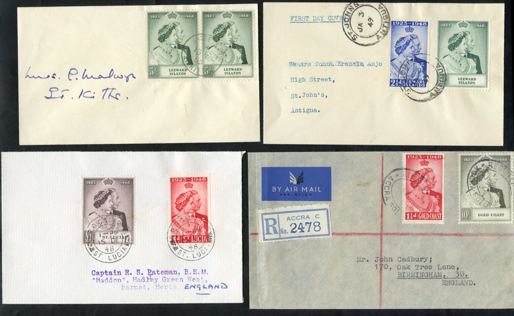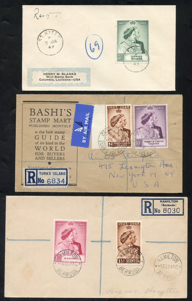 1948 Silver Wedding covers (7) incl. Bermuda, Gold Coast, Turks & Caicos Islands, St Lucia and Leeward Islands (3) - one with two 5s (2) & one with single 5s only. Fine.