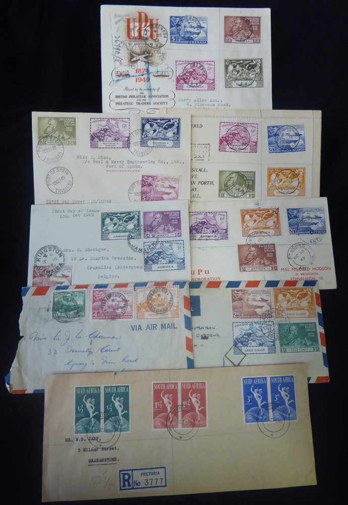 1949 UPU first day covers Antigua, Grenada, Jamaica, South Africa and Trinidad & Tobago, also Gold Coast and Virgin Islands full sets on cover and British Guiana 4c & 12c on cover with definitive 24c.
