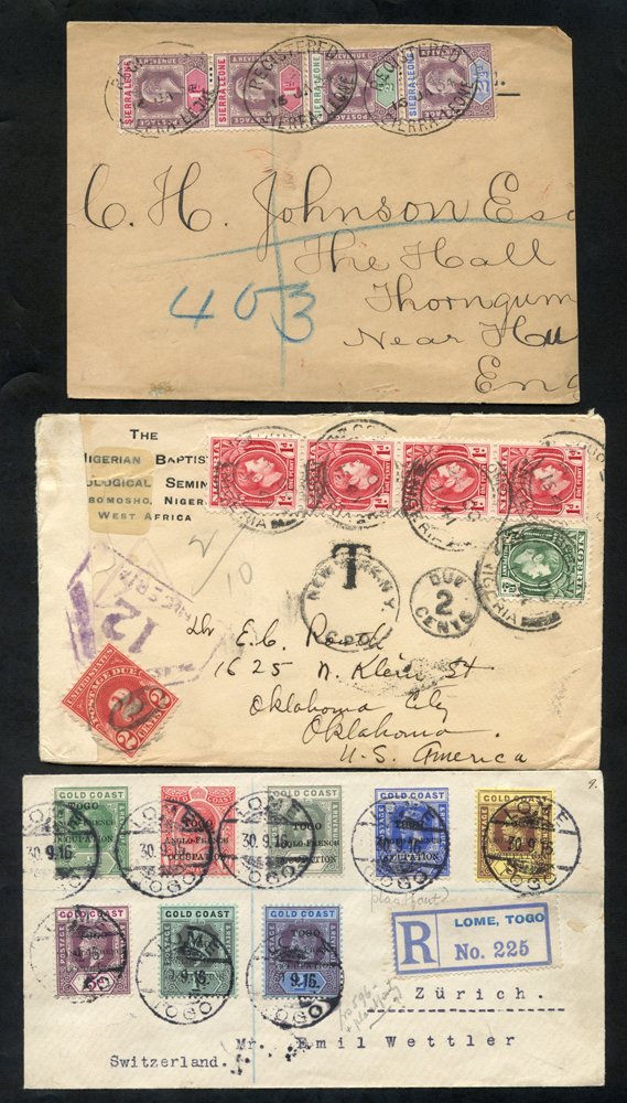 BRITISH AFRICA covers (61) and a few fronts, countries noted incl. Gambia, Nigeria, Northern Nigeria, Sierra Leone, Sudan, Mauritius, Seychelles, Swaziland and Cameroon (many registered & a few censored), also five fronts with B.O.F.I.C. stamps. Worth inspection.