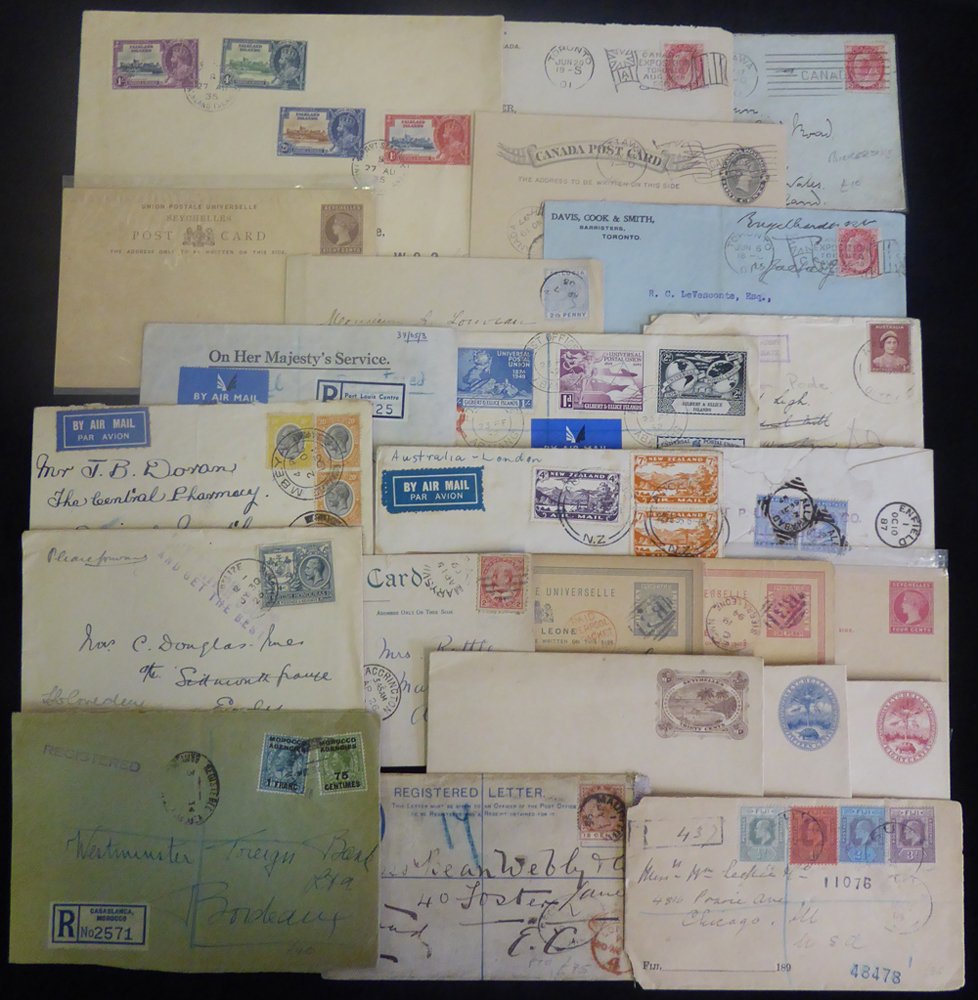 BRITISH EMPIRE MISCELLANY QV-KGV covers incl. 1904 Fiji registered with four colour franking, 1895 Mauritius multi franked reg envelope (faults), KGV Morocco registered, 1903 St. Lucia 2½d cover, Falklands Jubilee set, Canada early machine cancels (4), postal stationery etc. (24)