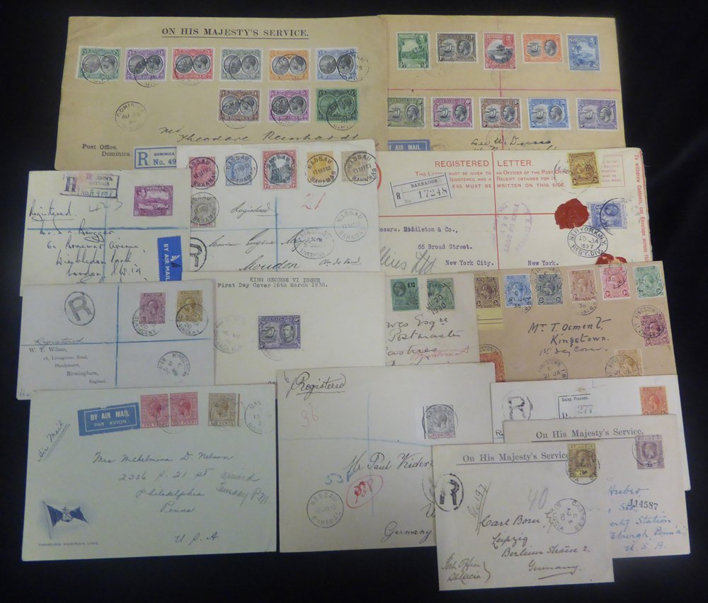 BRITISH WEST INDIES accumulation of covers, high values noted with KGVI Antigua & Grenada 10s and Cayman Islands KGV 2s. The majority of the covers are KGV or KGVI, careful inspection could well reveal some scarcer covers. (100+)