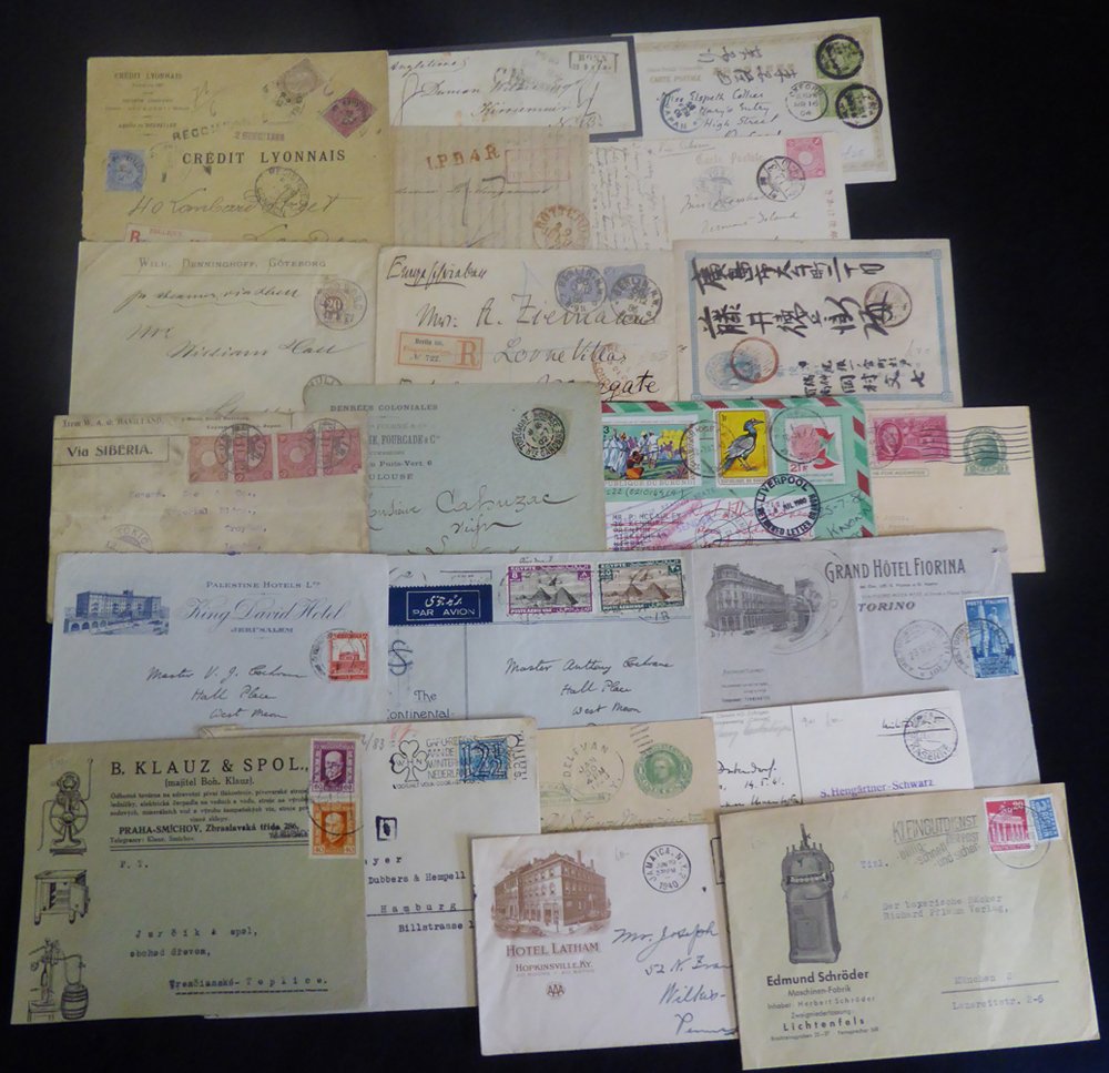 FOREIGN MISCELLANY early to middle period mail to UK from various foreign countries incl. 1854 unpaid E ex Bonn with 'CR' sorting mark, 1888 ex Italy with TPO b/stamp, 1896 Belgium reg with FNM d/stamp, 1886 Germany reg, Japan PPC's, advertising E's etc. plus 1833 Riga - France EL with fine strike of scarce HOLLAND/PAR/THIONVILLE entry. (21)