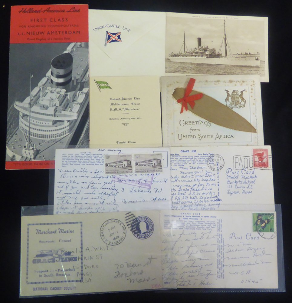 LINER & SHIPPING EPHEMERA 1930's-later assembly of United Fruit Co (Gt. White Fleet), Holland - America Line & Union Castle Line postcards, menus, booklets, passenger lists, sailings & fares, accom. plan of S.S Nieuw Amsterdam, also Grace Line covers, ship postcards, illustrated and named vessel cachets, WWI/WWII censored covers 1916 Bergensfjord cover, New York to Denmark, 1944 Gdynia Shipping Lines (Polish operating in London and addressed there), various other ship PPC's & covers, paquebot marks etc. Suggested viewing. (71 items)