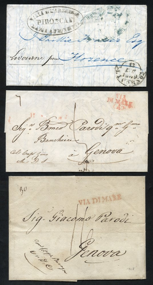 MEDITERRANEAN MAIL 1828-40 two EL's from Tunis to Genoa by named captains with s/line or three line VIA DI MARE marks, the latter item slit for disinfection (both ex Robertson collection), also 1849 EL Naples - Florence with clear oval VILLA DI MARSIGLIA/PIROSCAFI/MARIA ANTONIETTA ship's h/stamp. Attractive trio. (3)