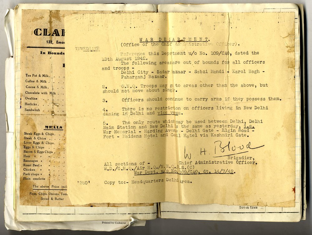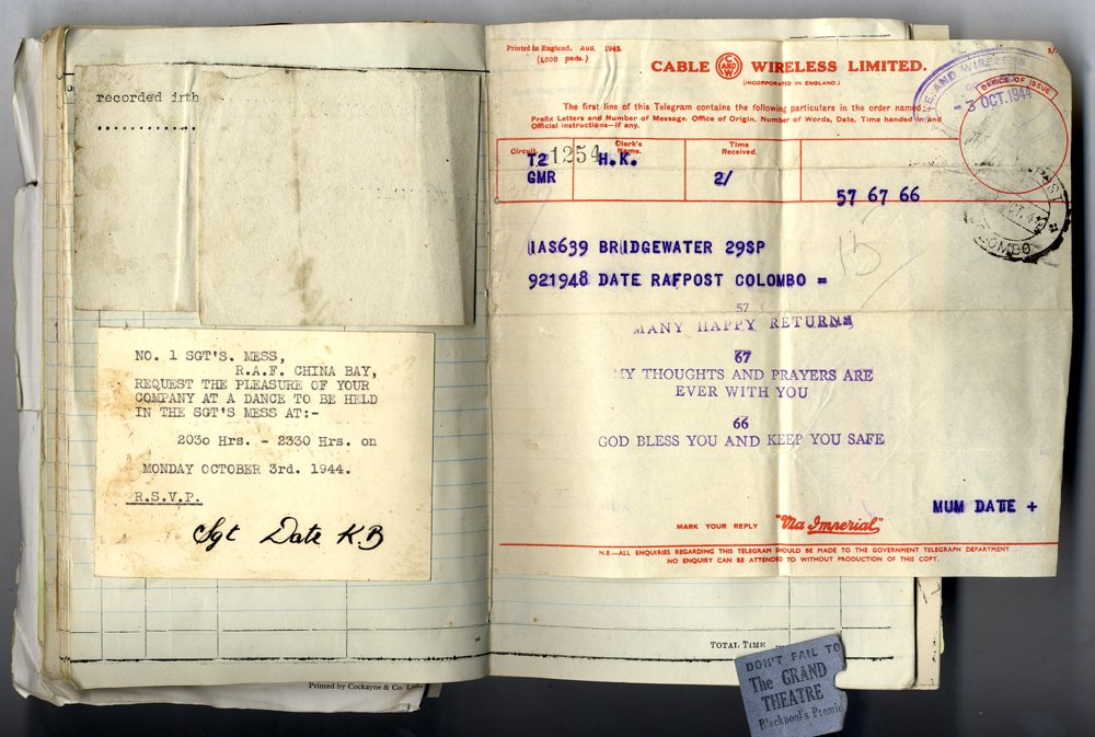 WWII scrap book formed by R.A.F Sgt. K. B. Date serving in Egypt, India & China Bay Station Ceylon, includes many cuttings & illustrations advertising films & stars of the time, other entertainment, menus, beer mats R.A.F forms, telegrams & shopping receipts. Contains War Dept order issued during 1942 Delhi riots, also several loose items.