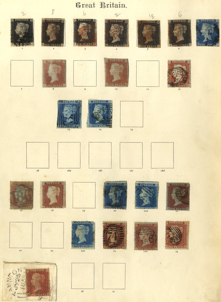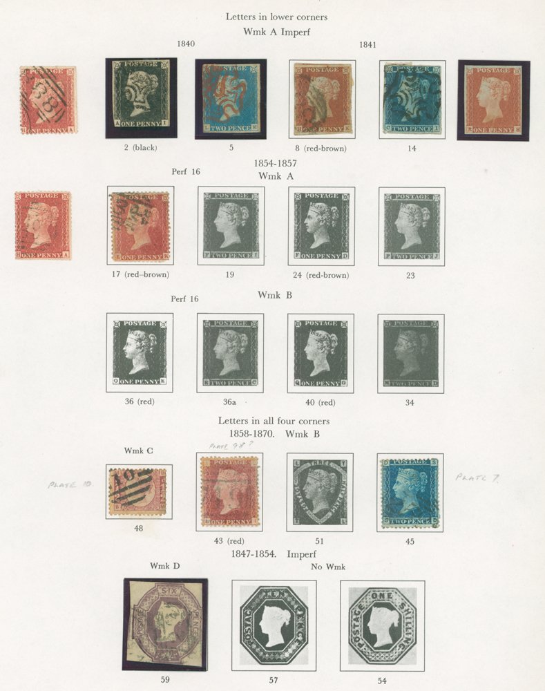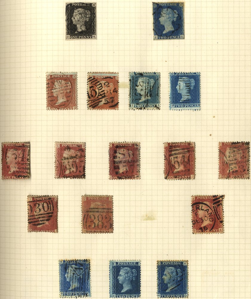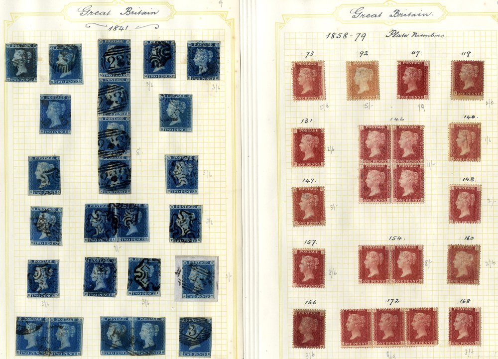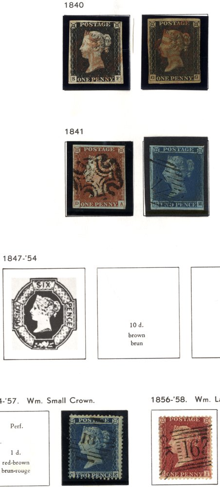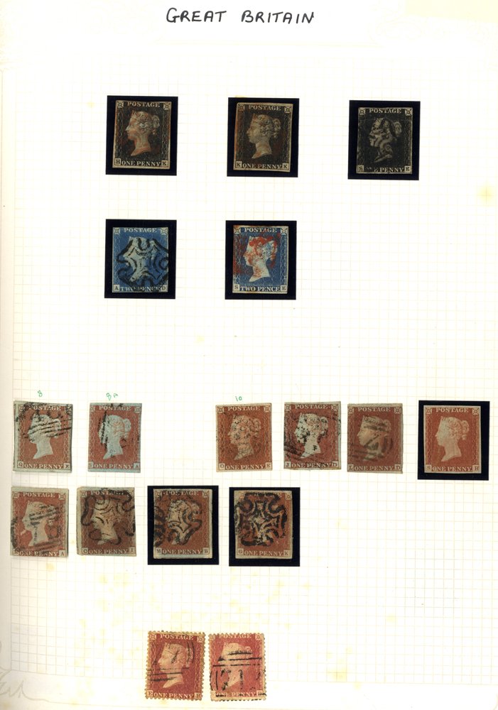 COLLECTION 1840's-1960's collection housed in a Simplex Junior album from 1840 1d blacks (18) + pair - mixed grades (8 are four margined), 1840 2d (4) + pair (single + pair are four margined), 1841 1d range singles, pairs etc. Mixed grades (130+), 1841 2d (22), pairs (4), vertical strip of four, Perf Line Engraved incl. 1d Stars (39) incl. odd M/unused, 2d Stars (2), Plate Numbers on 1d reds M range incl. odd pair/block, 1870 ½d Bantams incl. M/unused (15), 1847 Embossed 6d (3), 10d - all faults, Surface Printed ranges both M/unused & U, KEVII M vals to 2/6d, U vals to 10s, KGV M ranges incl. a few controls. Condition is mixed, still a nice original lot offered intact.