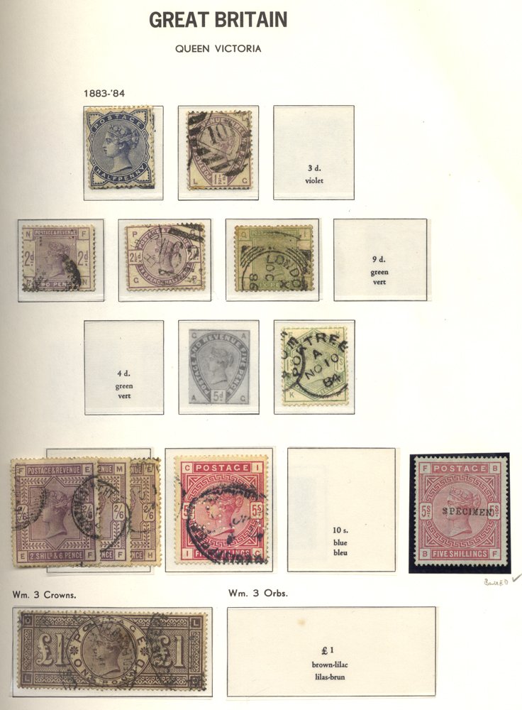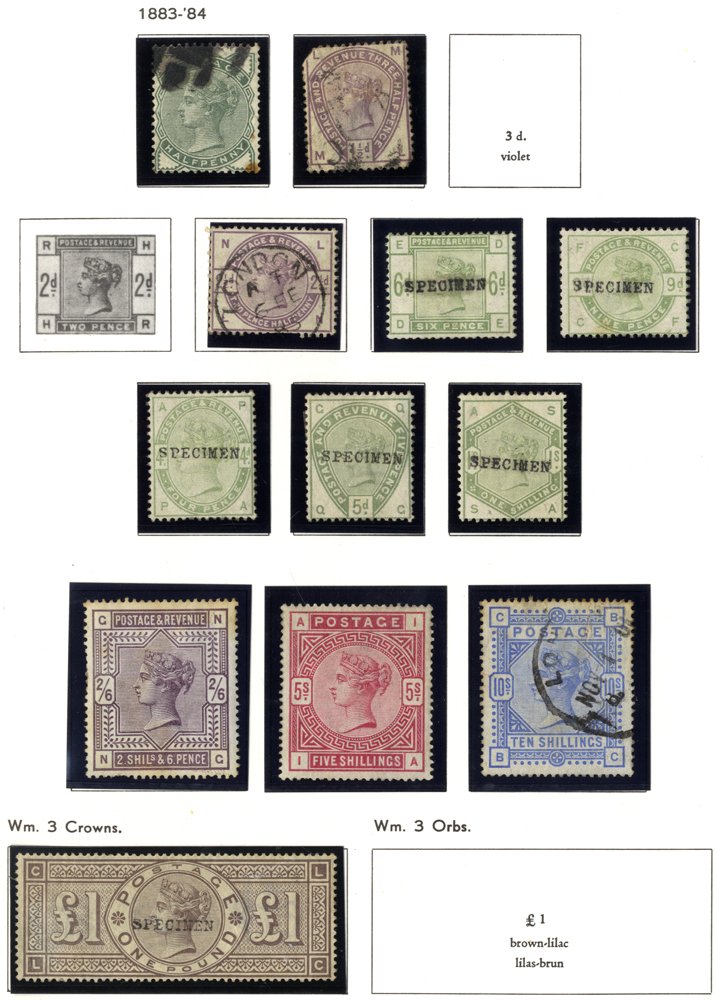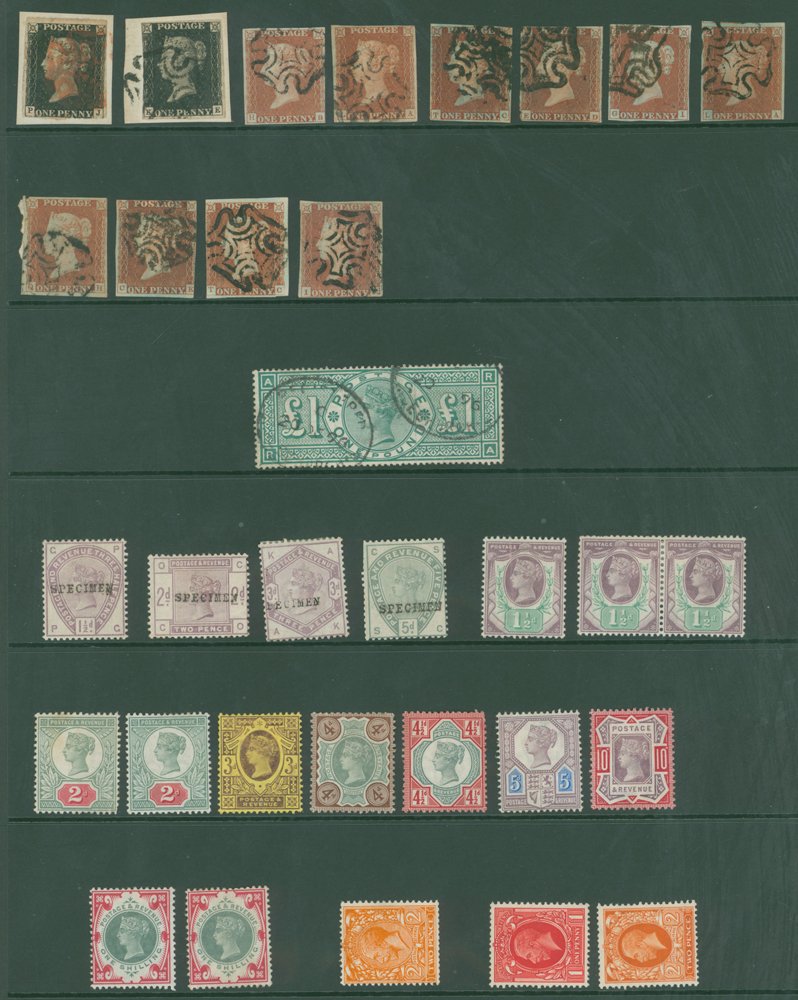 1840-1953 miscellaneous range of M & U on hagner leaves or album pages from 1840 1d (2) - three margins, 1883 lilac & green optd SPECIMEN 1½d, 2d, 3d & 5d, 1887 Jubilee vals to 10d & 1s green & carmine (2) M, 1891 £1 green FU, KEVII set to 5s U (3 of each val), Seahorses 2/6d (5), 5s (3), 10s (4), good to FU, 1934 Re-engraved 2/6d, 5s & 10s U (2 of each), also set of three M, 1929 PUC wmk inverted set UM, £1 PUC FU, 1939 High Value set M & FU, 1937 Dark Colours set (excl. 3d) in M blocks of four, 1952 Tudor Crown set UM etc. (773)