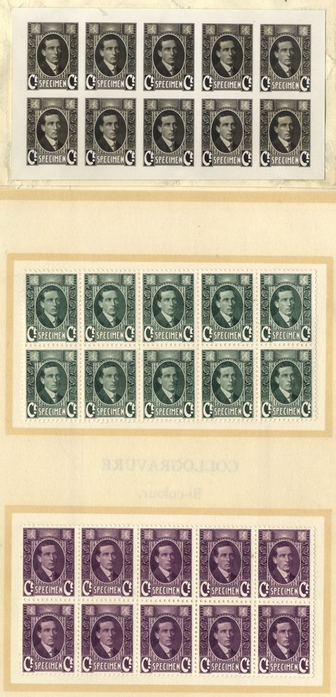 1923 HARRISON & SONS (London) cut down page from a sample booklet for use by Harrison reps, comprises two blocks of ten in green & purple 'SPECIMEN,' additional block of matching bromides. Printed from Cylinders by the Dutch firm Nederlandsche Rotogravure Maatschappig of Leiden. Unusual items.