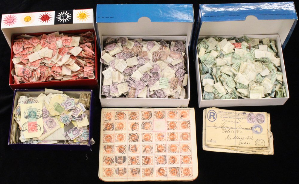 1881-1902 off paper used accumulation of low value defins comprising 1881 1d lilac, 1902 ½d & 1d. (many 1000's for sorting).