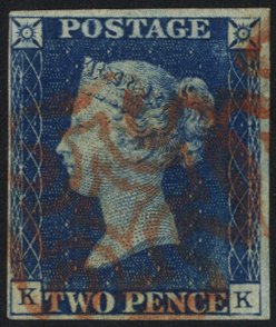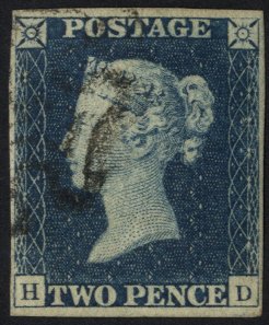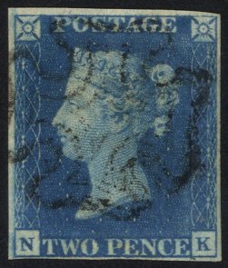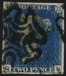 Plate 1 QD 2d blue, four large even margins, boldly struck black MC showing a virtually completely solid centre to the cross. SG.5.