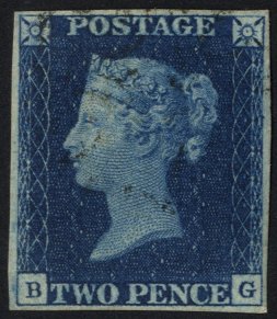 Plate 2 BG 2d deep full blue, four good margins, lightly struck, fine black MC. SG.4. (1)
