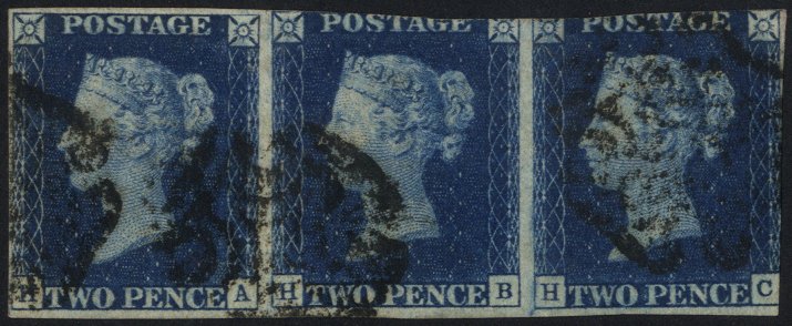 Plate 2 HA-HC STRIP OF THREE, HA is a four margin example, HB/C cut into at top & right side, cancelled black MC's. (3)