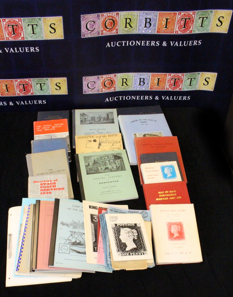 Various Publications mainly relating to postal history incl. postal cancellations of London - Westley, British pmks - Alcock & Holland 2nd edn & revised edn (1977), History of the post in Derby - Wilson, postal history of Doncaster - Sedgewick, Leicester & the post - Dibden, postal history of Kingston-upon-Hull - Craven & Fowler, experimental duplex cancels of Scotland, Isle of Man pmks surface & air - Massy, Penny Red stars - Tonna, The Stamps of GB part I, The Line Engraved issues - Seymour, Ormond Plating cards, Postage stamp varieties illustrated - Alcock & Meredith & more smaller publications.