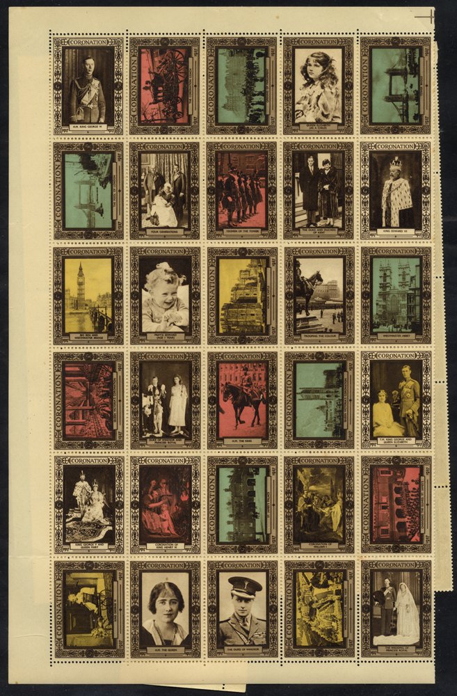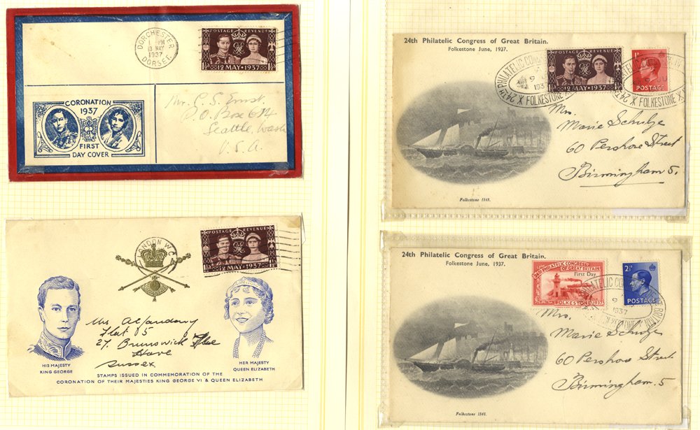 1937 Coronation collection of stamps, covers & ephemera in album incl. marginal single of the 1½d stamp signed in margin by Edmund Dulac, several M blocks, controls, varieties, covers incl. FDC's (plain & illustrated), first flight covers, congress covers, Coronation official souvenir programme, Cinderella labels split sheet of 60, sheetlets of 8 in 3 different colours etc.
