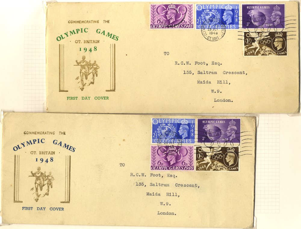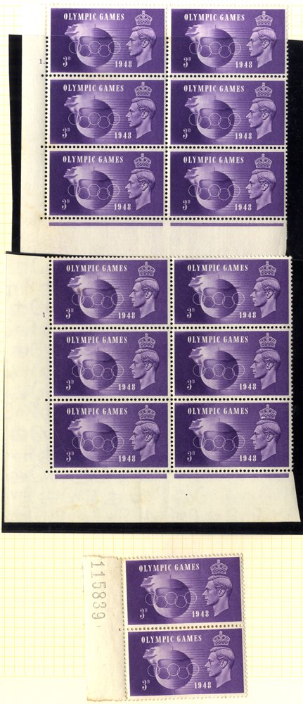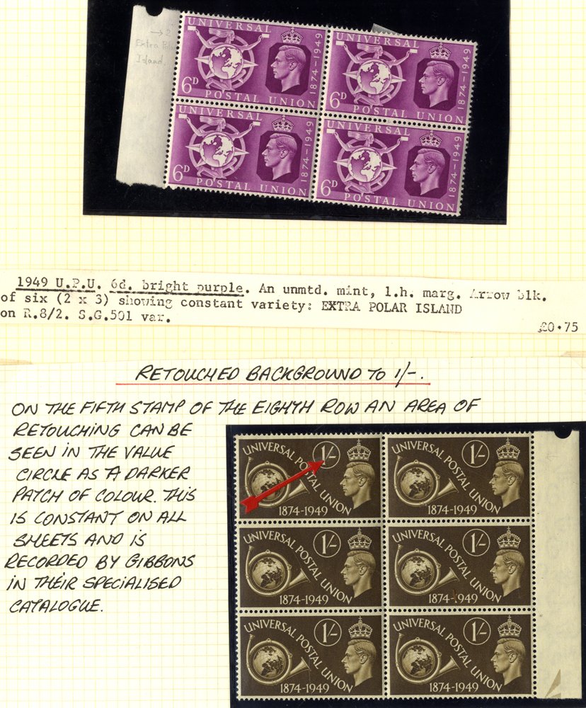1948 Olympics & 1949 UPU collection on leaves of 356 stamps & 19 covers incl. Olympics Cyl blocks, marginal blocks etc. some varieties incl. Olympics 2½d ear lobe flaw in Cyl. block, 3d hooked '3' & crown flaw in block together, Cyl. 1 block 9 incl. crown flaw, Cyl 1 block of 6 incl. crown & hooked '3', VFU multiples, FDC's (7) etc. UPU incl. Cyl. blocks, marginal blocks etc. Noted retouched background to 1s block of 6, illustrated FDC's (4) etc. SG 495/502 (375 + 18 covers)