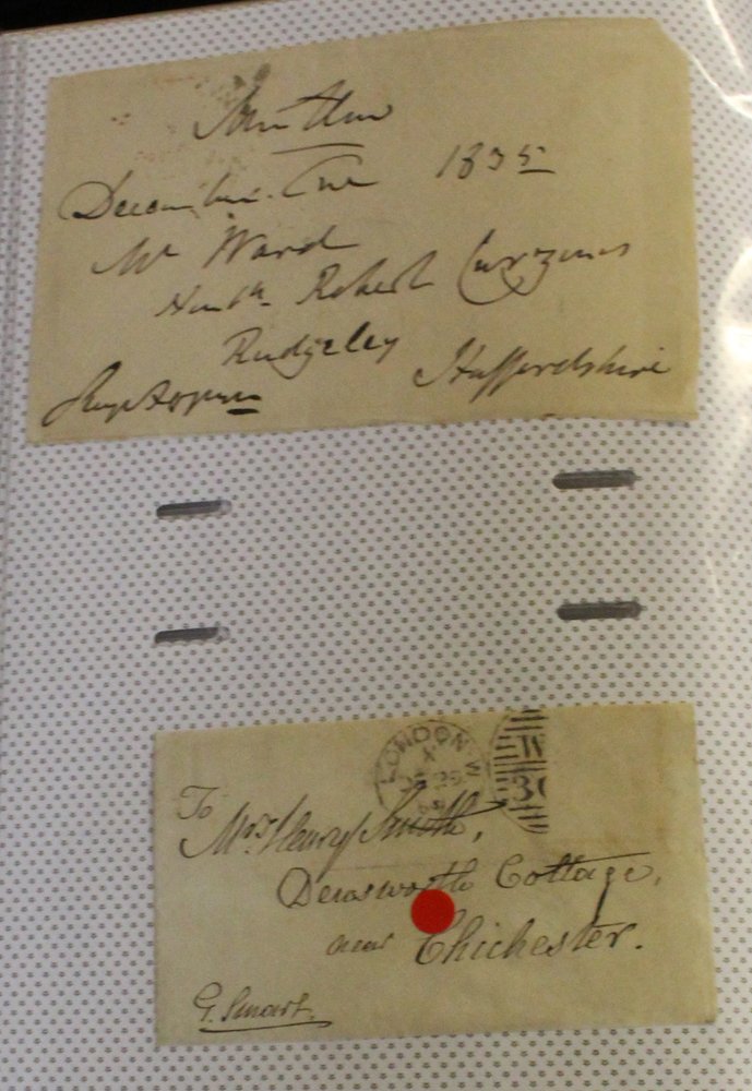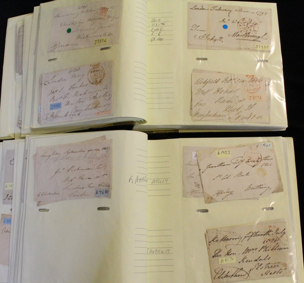 1800-51 ALBUM OF STAMPLESS COVERS all fully transcribed and neatly displayed in protectors incl. 1807 EL regarding the sale of property belonging to Naval Captain Sir Philip Yorke from Southampton to Gosport with Southampton mileage mark charged at 5d. 1815 EL from Broadhampton to Shaftsbury showing extensive accounts bearing Newton Abbot straight line, 1815 EL from Woolwich to Gloucester from a soldier to his mother regarding his accident and assuring her 'the horse was not much hurt, it is a beautiful creature and has no fault but too much spirit...' He died in 1841 of fever caused by sleeping in wet clothes after the battle of Medjez, further extensive transcribed EL's marks incl. 1824 Morpeth mileage, 1825 Rugby mileage, 1826 Newcastle/5th clause post, 1828 Tavestock u.c, 1832 Christ/Church, 1835 To Pay/2d/only, 1839 EL bearing penny post marks of Twickenham & Hounslow etc. (26)