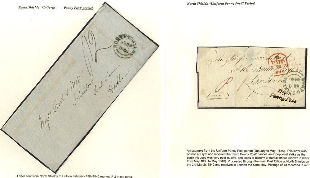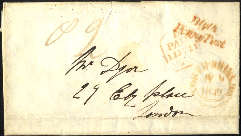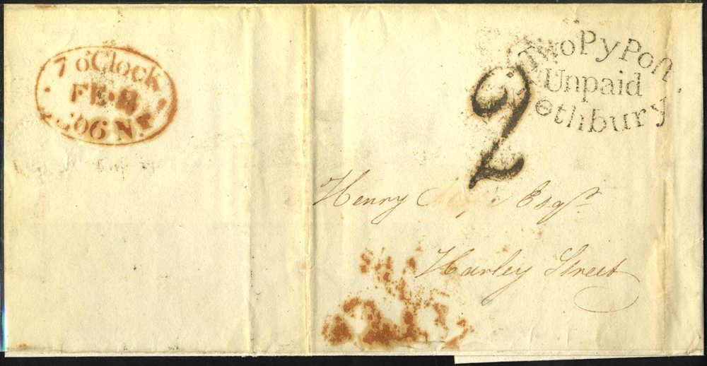 LONDON 1801-48 Album of stampless covers to or from or through London, all fully transcribed in protectors incl. 1805 letter from solicitors regarding the sale of Lord Yarborough's trees for £17,000, 1828 printed three page Thames & Medway canal proceedings with red 'Lombard St/3py p.paid', various other marks, 1805 Twickenham/3py p.paid, large oval '7 oclock Night two penny p.paid', 1809 Newcastle U.T mileage, 1830 Inspectors crown in red, 1840 'Putney SO/1py p.paid', etc. (28)