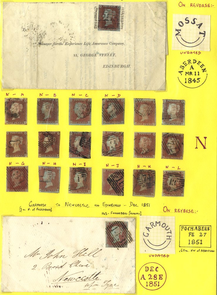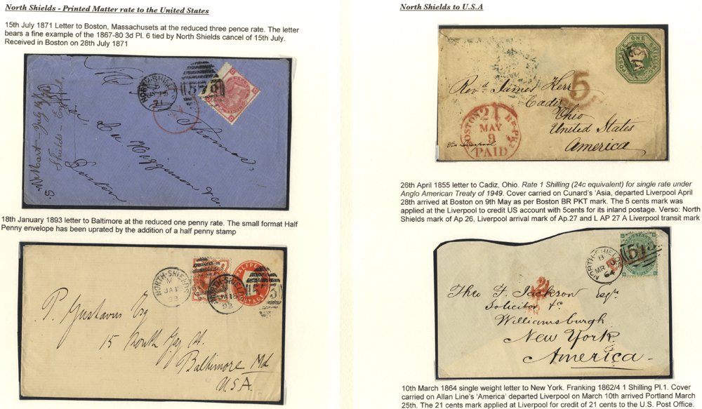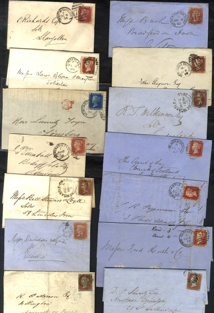 NEWCASTLE UPON TYNE 1852-98 range of 55 items of mail from or to Newcastle incl. 1841 1d covers, Perf Line Engraved, 1d pinks, surface printed on covers to Europe & USA, duplex cancels incl. Newcastle sideways, Newcastle Quayside, Sunderland, South Shields etc.