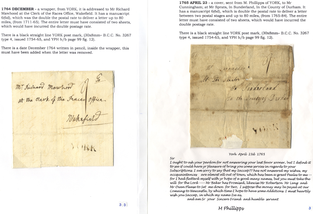 YORKSHIRE 1760-65 group of letters mainly to Yorkshire addresses, five with straight-line 'YORK' marks including two 'ounce rate' items, one to the Races Office at Wakefield (1764), London redirected etc. (6)