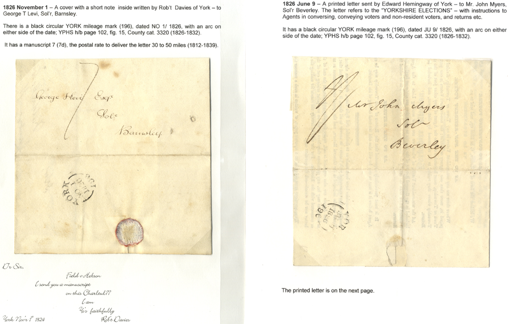 YORKSHIRE 1826-49 covers incl. single-ring mileage marks (7) - one at the 1oz rate, single and double arc c.d.s in red or blue, corrected rate, railway shares document & circular 'YORK 1D PAID' item. (11)