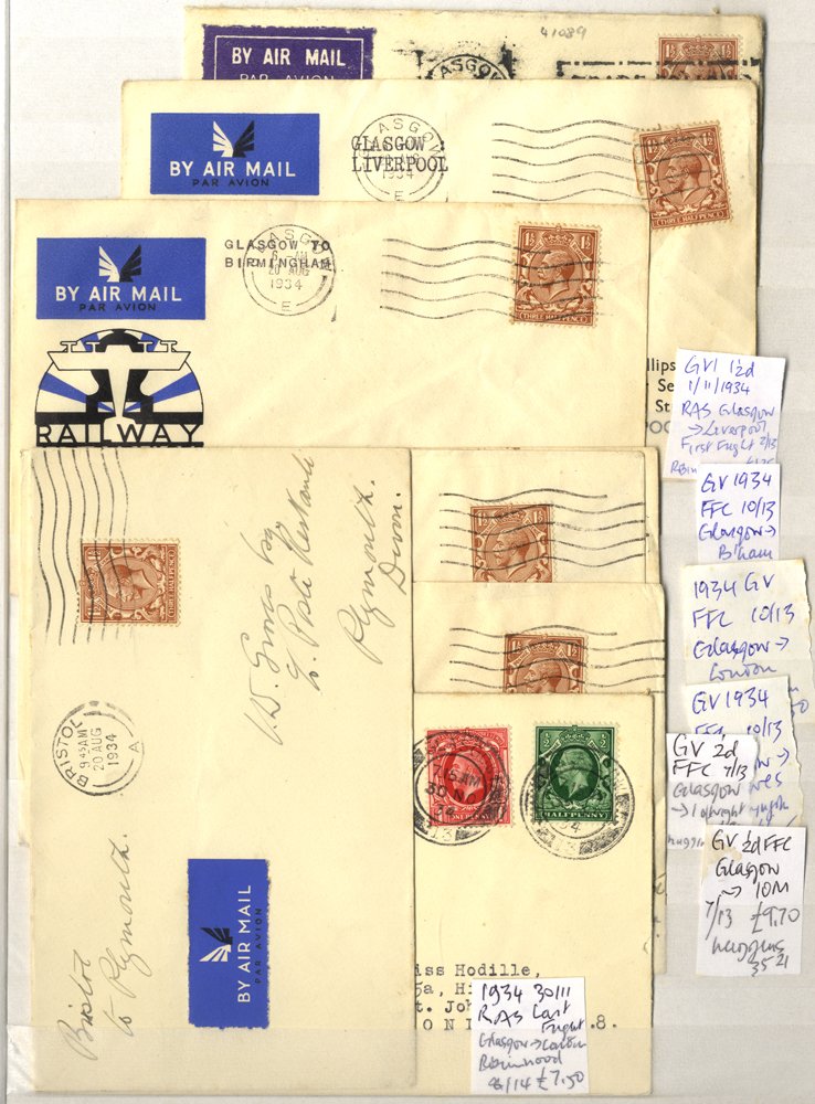 1934 collection in album of mainly railway air service (RAS) illustrated first flight covers of variations UK routes, also few Highland airways, Provincial airways & Mac Robertson air race London - Melbourne, etc (100+).