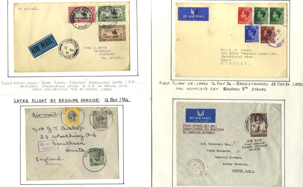 Africa - KGV-KGVI covers flown to African destinations inc attractive item to Gold Coast, South & East Africa,, 1930s FFCs inc Tanganyika & S. Africa, interesting Nigeria group, Sudan, Morocco etc with a few incoming. Mainly 1930s. (39)