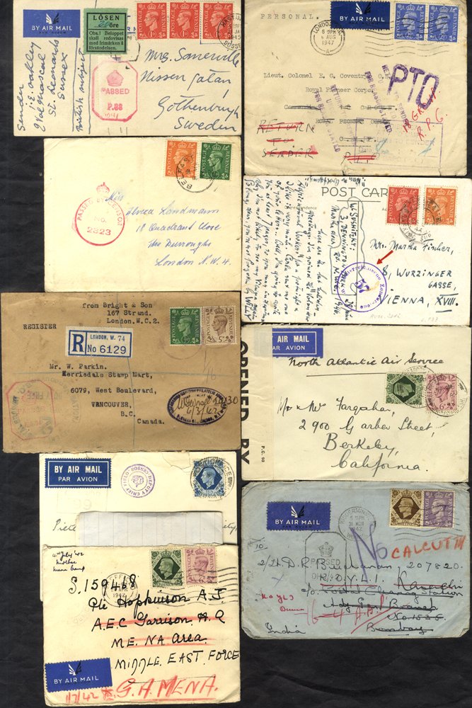 World War Two - Accumulation of covers & cards with KGVI frankings, mainly WWII period airmail items inc. censored, service suspended, redirected, underpaid, good study of rates with variety of destinations. (70)