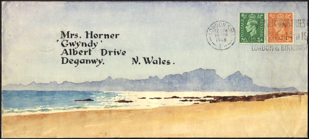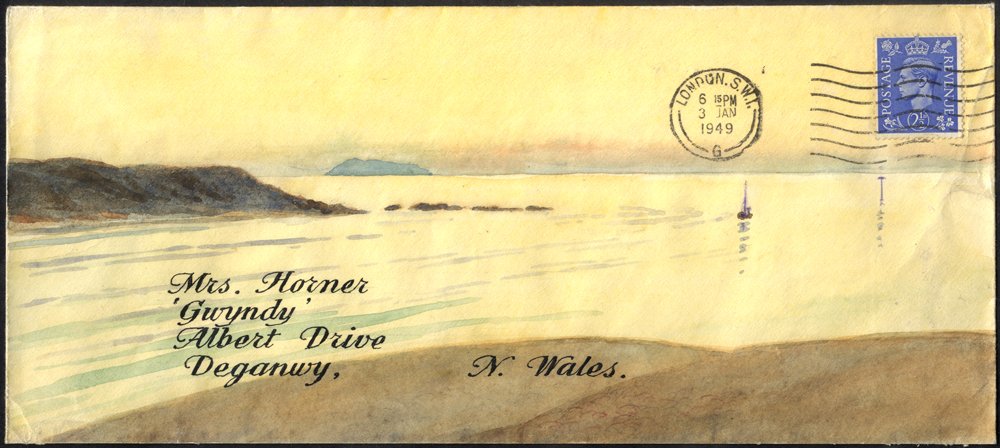 1948-49 The Mrs. Horner correspondence, three envelopes addressed to Deganwy, N. Wales, each bearing KGVI defins, tied London cancels, each hand painted 'all over' watercolour landscape scenic views. (3)