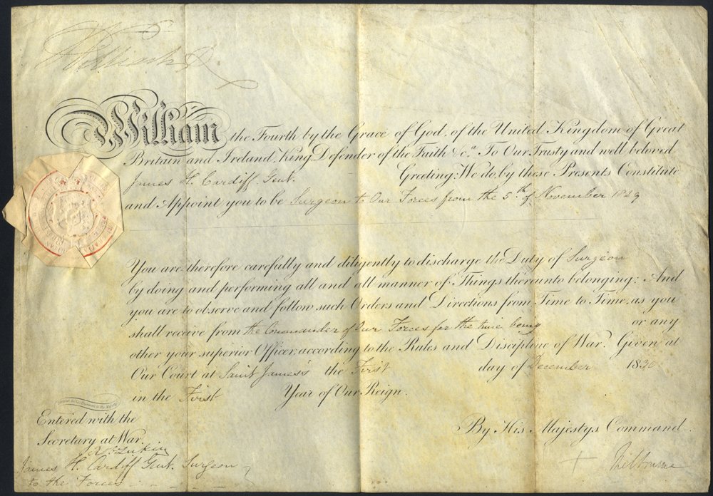 WILLIAM IV document dated 5th Nov 1829 appointing James. H. Cardiff to be surgeon to our forces, signed at head by the King William R.