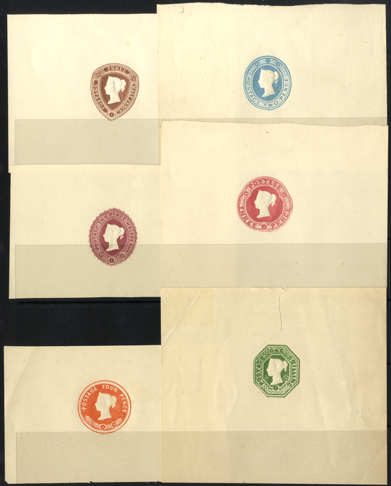 1882-91 postal stationery cut down proofs, file reference examples on white woven paper for 1½d brown, 2d blue, 2½d lake, 3d carmine, 4d orange & 1s green. (6)