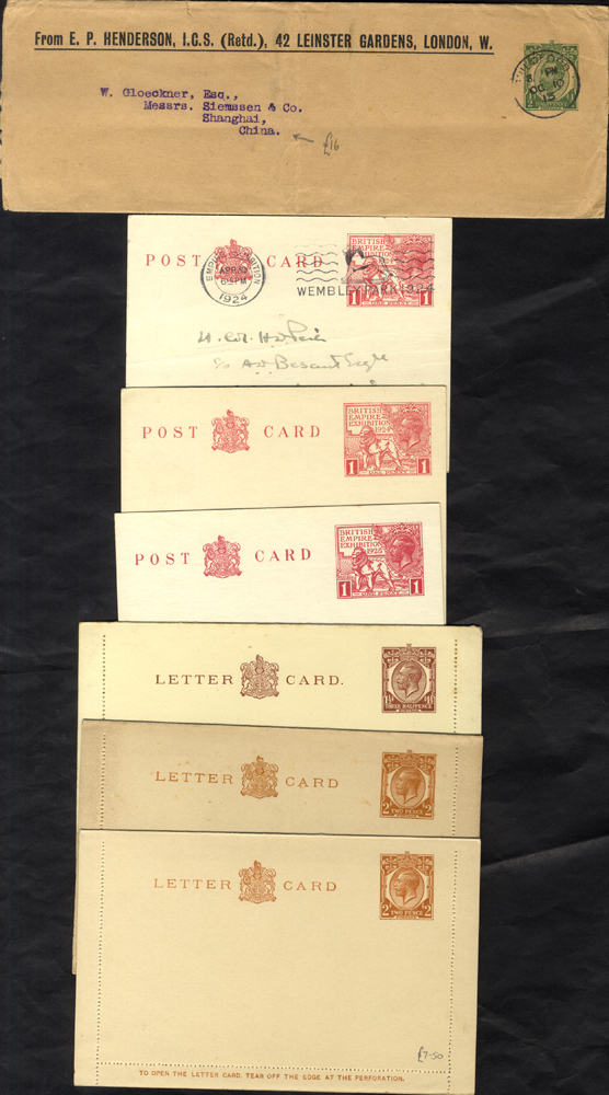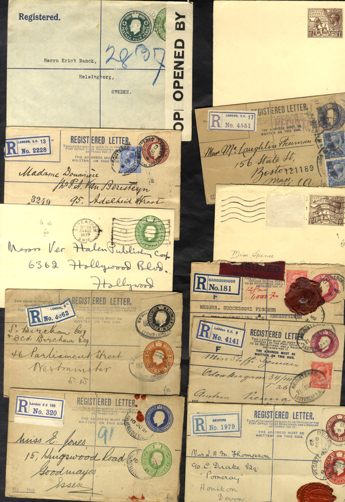 KGV items M & U incl. registered E's with 1920-21 ½d, 1d & 2d upratings plus standard types (insured item noted); also a range of cards, envelopes (censored 4½d STO to Sweden noted), use of cut-outs etc. (33)