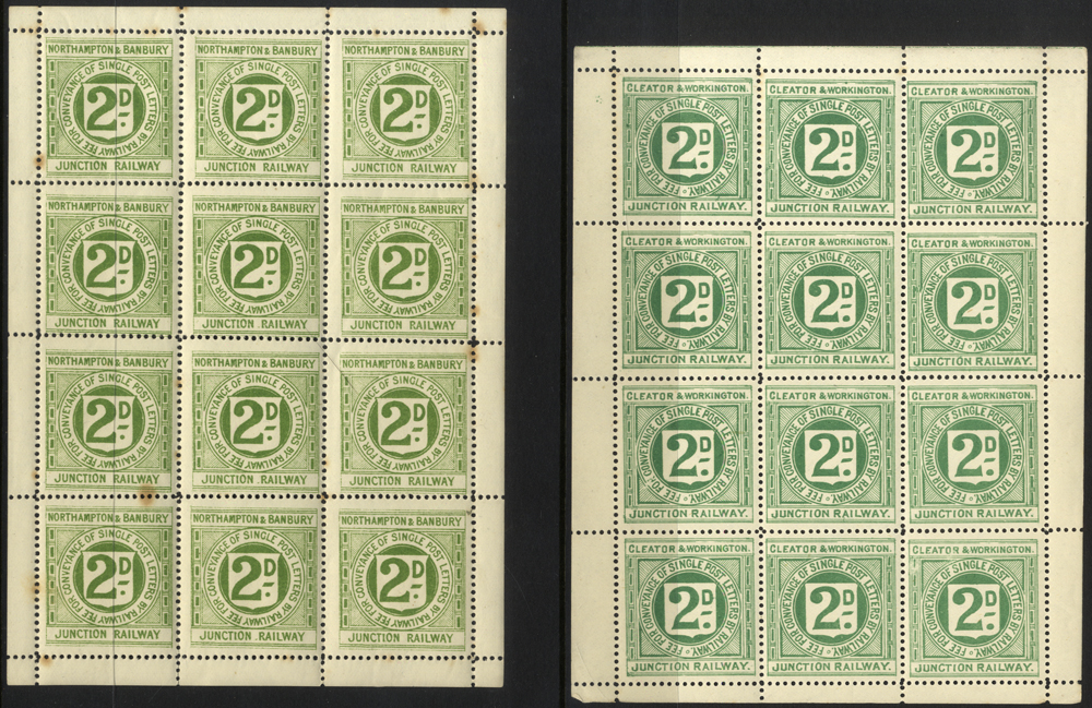 CLEATOR & WORKINGTON JUNCTION RAILWAY 1891 2d bluish green, a complete sheet of 12 fresh UM, also Northampton & Banbury 1890's 2d green, a complete sheet of twelve UM (tone spots affecting six stamps) (24)