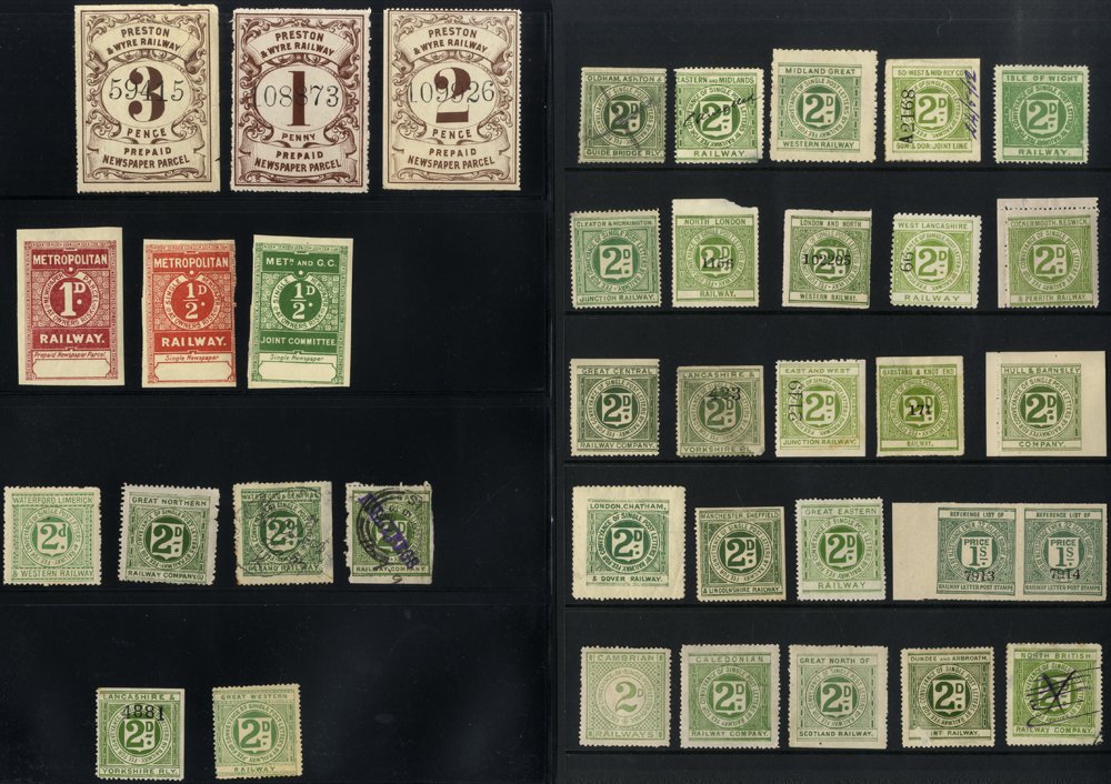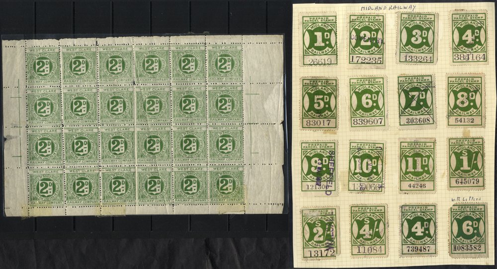 RAILWAY LETTER STAMPS & pre paid parcel stamps incl. West Clare 2d sheet of 24 (some creasing), single 2d mainly unused in mixed condition (31), Midland rwy. parcel stamps (16), Preston (3), Metropolitan (3), etc