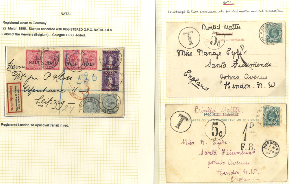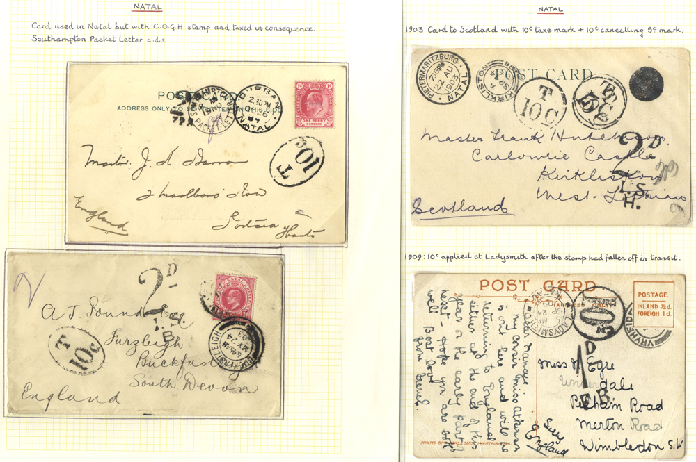 Collection of postal stationery (written up) with M & U newspaper wrappers, postcards & letter cards. Noted - a very interesting study of the tax markings on 13 under paid postcards & covers, showing the many different types of tax h/stamps between 5c & 20c as well as pence tax markings. Viewing recommended. (52) £130 to 180 £130.00