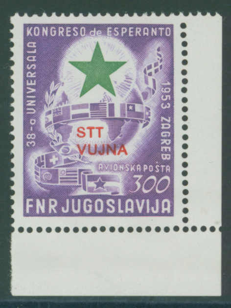 Allied Military Govt 1953 Air Esperanto Conference 300d green & lilac (instead of green & violet) UM corner marginal example, SG.B98 var. (Cat. £400 as normal) Sass A20cb, RPS Cert. 2008. (1) £80 to 100 N/S