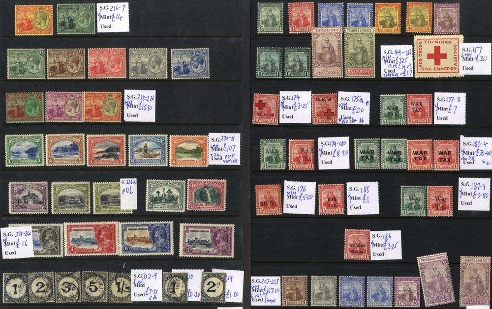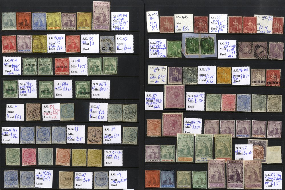 1857-1960's chiefly M collection on hagner leaves from Trinidad commencing with a few sitting Britannias good to FU, 1869 CCC 5s rose lake M, 1883-94 ½d to 5s set M, 1896-1906 ½d to £1 set, 1904-09 vals to 5s (3), Tobago 1882 ½d U, 2½d o.g. (2), 1885-96 vals to 1s M, 1886 ½d on 2½d (2) M, ½d on 6d M, 1d on 2½d M, 1896 ½d on 4d lilac & carmine FU, Trinidad & Tobago 1913-23 MCCA set M, several War Tax, 1921-22 MSCA 1d to 5s M later incl. 1938 Defin set M, 1948 RSW set M etc. Mixed condition throughout. S.T.Cat. £3000+. (198)