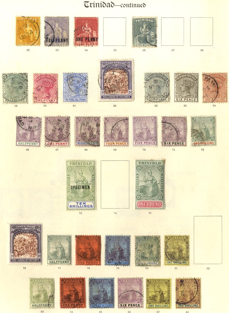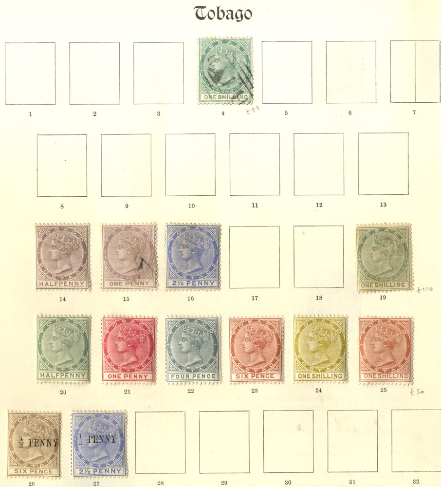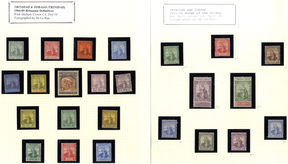 Collection of M & U on old Imperial leaves incl. Tobago incl. 1879 1s green U, 1885-86 ½d to 1s M, Trinidad incl. Seated Britannias imperfs incl. 1d blue M, perf issues vals to 6d (3), 1s (4), 1883-94 6d M, 1s U, 1896-1906 mainly U to 1s, 10s optd SPECIMEN, £1 M (faults), 1901 to 1s U, 1904-09 1s M & U, good range of War Tax & later issues to 1935. (145)