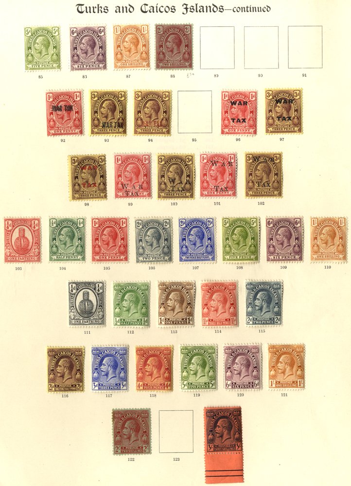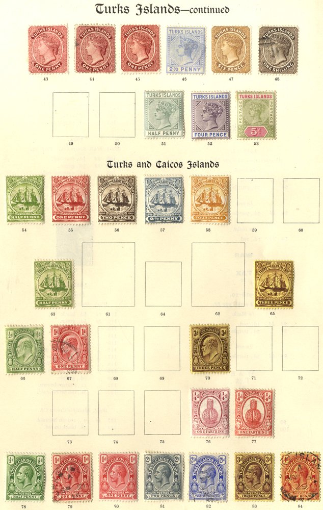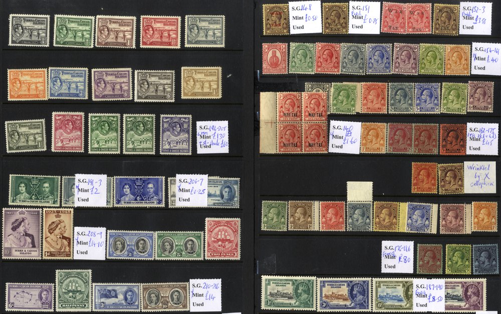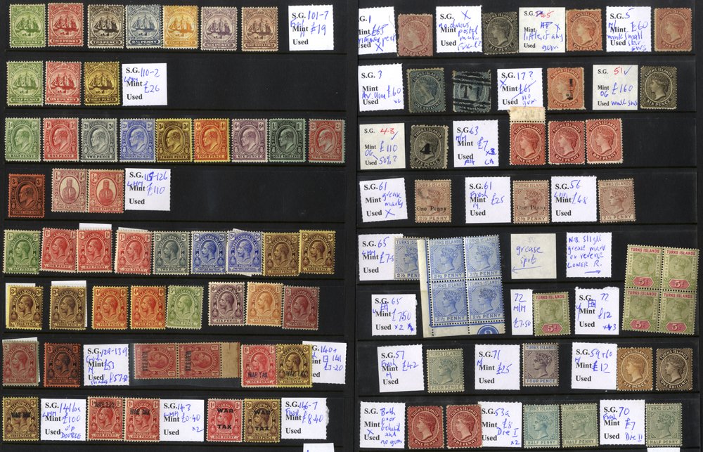 1867-1966 mainly M collection on hagner leaves from Turks Is 1867 1s dull blue U, 1873-79 1d dull red o.g. 1881 4 on 6d black part o.g. 1881 CCC (sideways) 6d olive-black (SG 51) unused, 1889 1d on 2½d o.g. 1889-93 2½d SG 65 & 1894 5d SG 72 both M blocks of four, Turks & Caicos 1900 CCA set to 1s M, 1909-11 MCCA set M, 1913-21 MCCA set M, various War Tax, 1921 MSCA most to 3s, 1928 Postage & Revenue set M, 1935 S.J. set M, 1950 Defin set M, 1948 RSW set UM, 1950 Defin set UM, 1957 Defin set M etc. Condition a little mixed in places. S.T.Cat. £1500 (203)