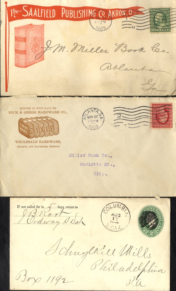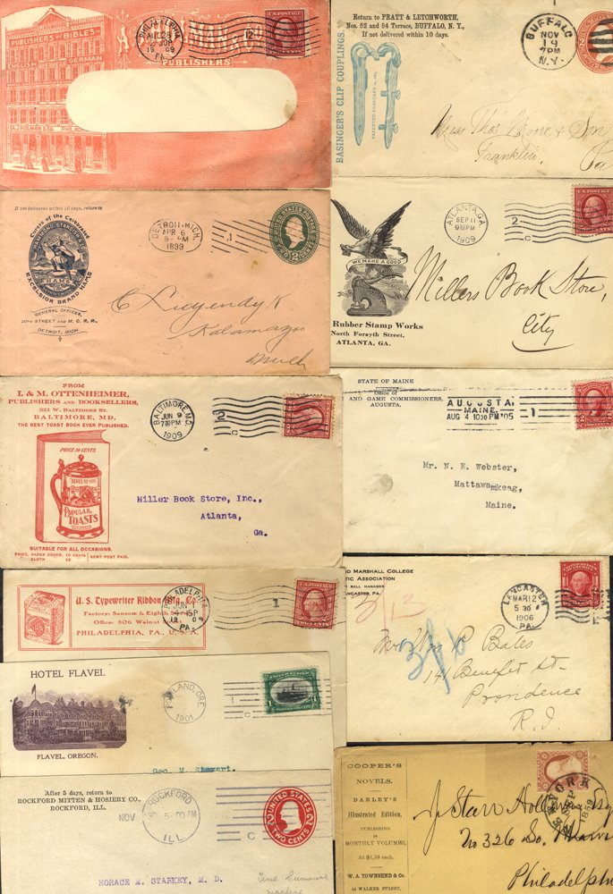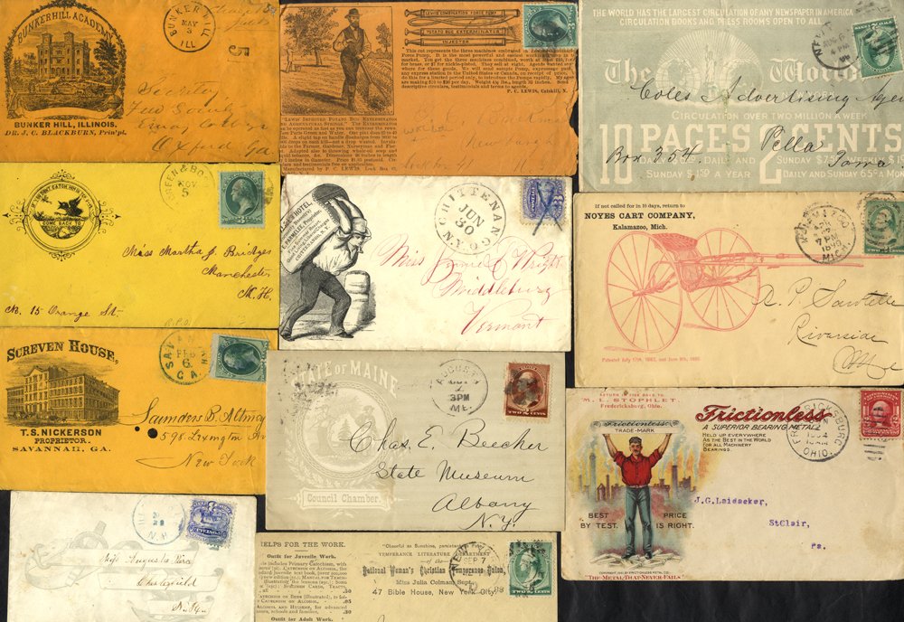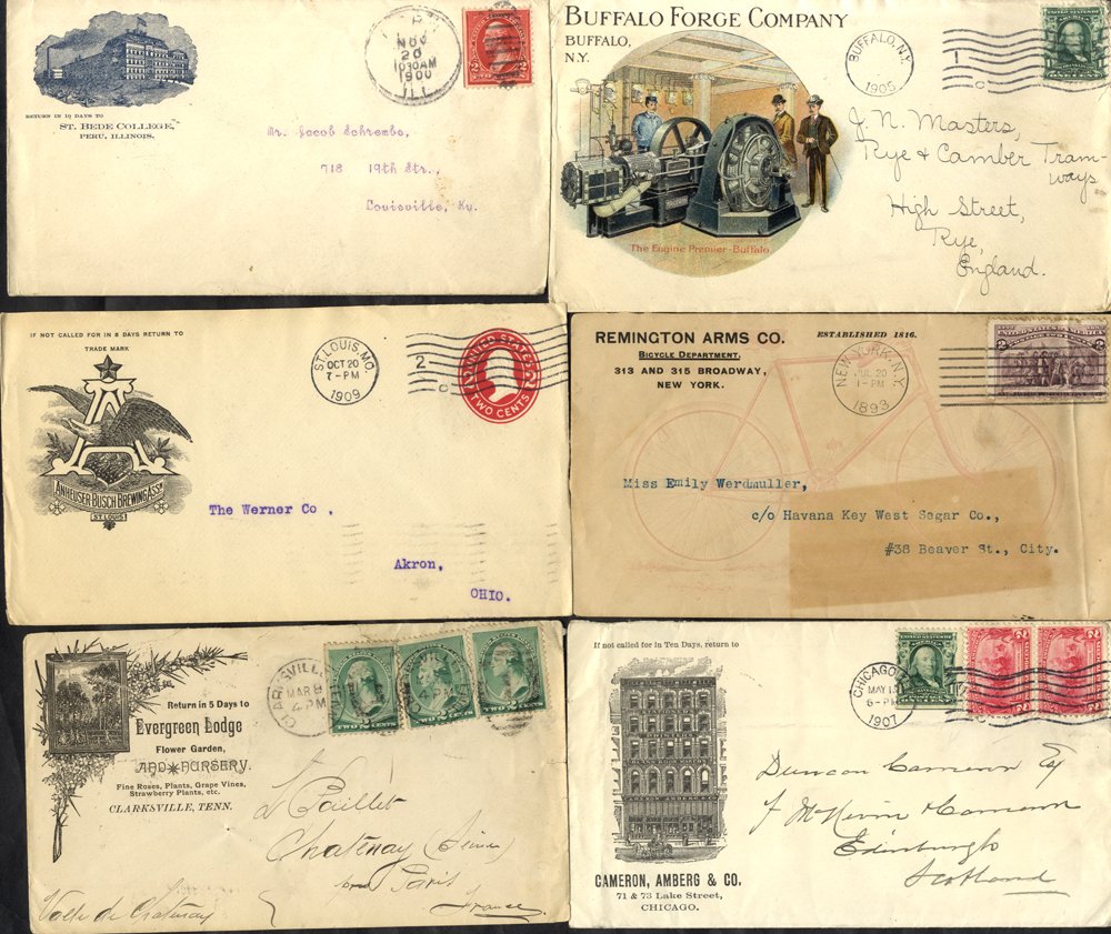ADVERTISING MAIL 1859-1910 range of covers (28) of which 23 bear printed commercial advertising illustrations, a wide range of products or services incl. 'The World' - largest circulation of any newspaper in America, Hubbard the Jeweler, Boston Young Men's Christian Ass, Buffalo Forge Company, Anheuser-Busch Brewing Ass, Remington Arms Bicycle Dept, Eagle Rubber Stamp works US Typewriter Ribbon Co, AJ Holman Publishers of Bibles.
