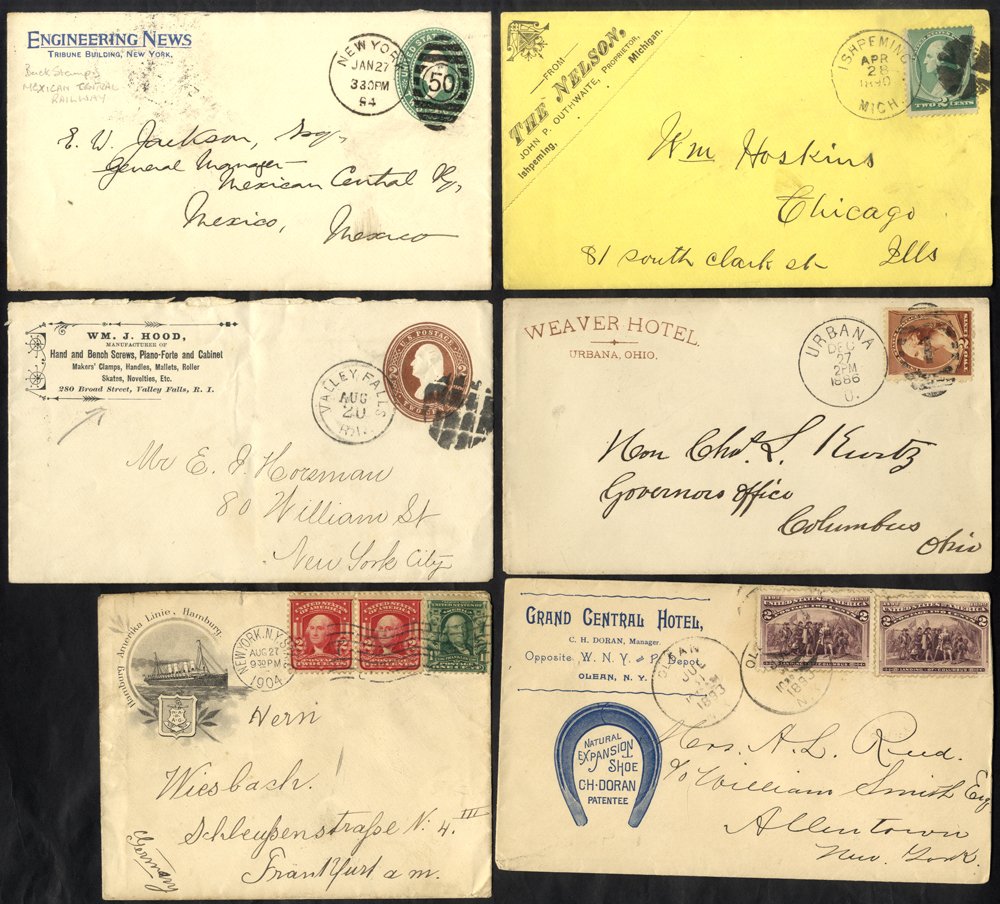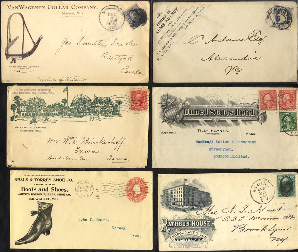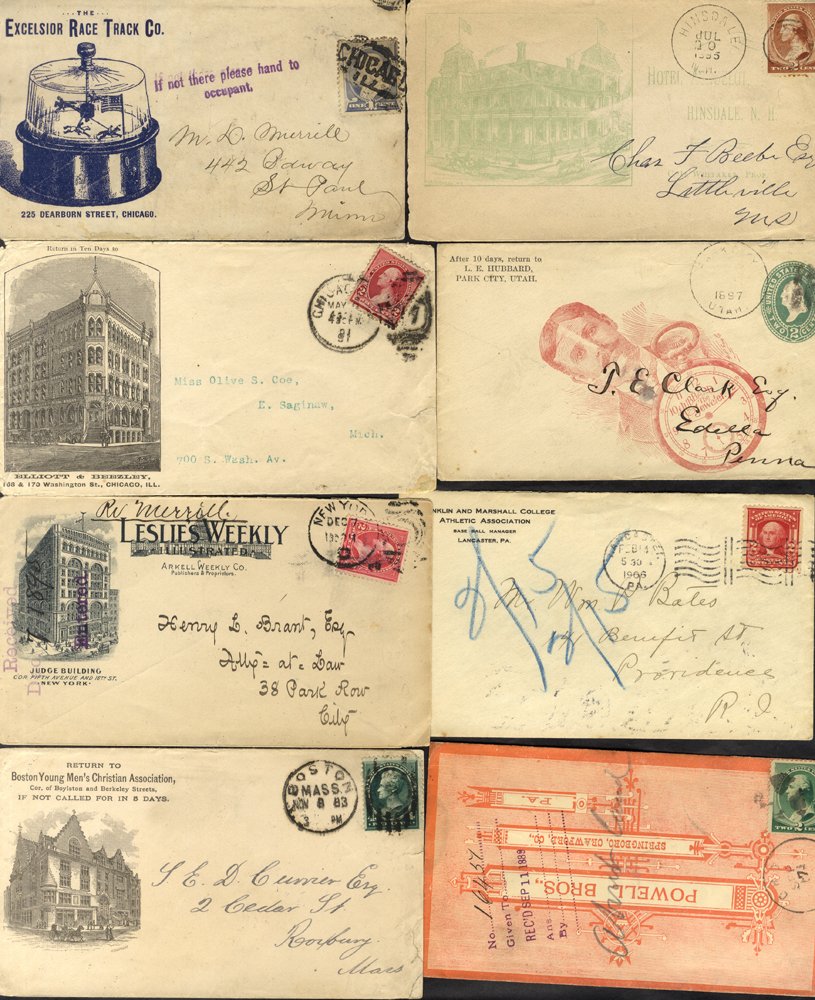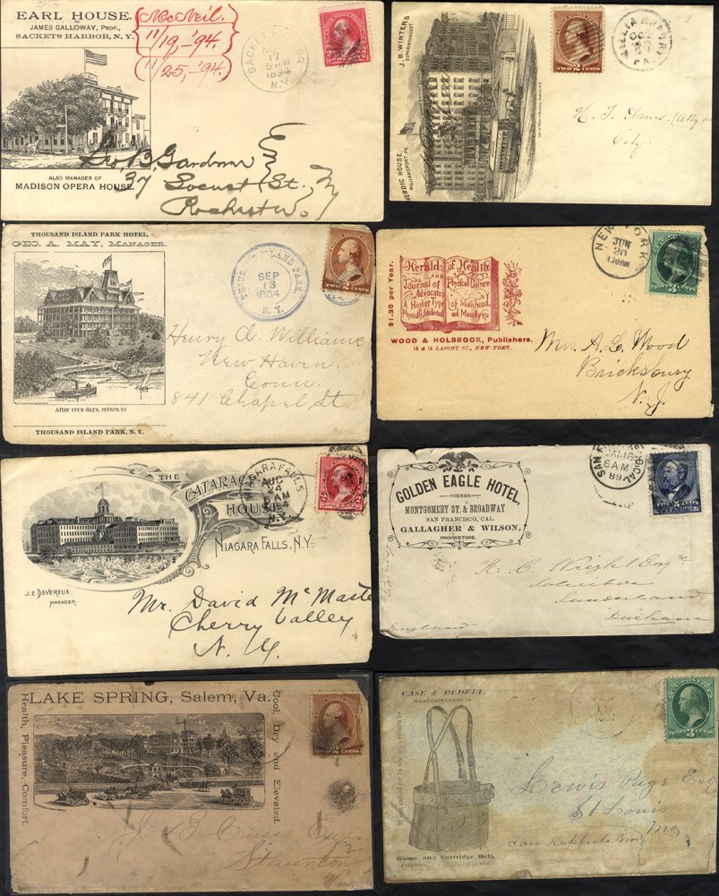 circa 1880's-1905 Advertising covers (19) all postally used bearing a variety of mainly pictorial images incl. Hotels, Tourist, Hamburg-Amerika Shipping Line, Beals & Torrey Shoe Co., Remington Arms etc. mixed condition.