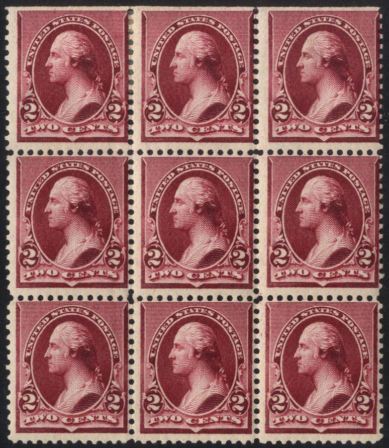 1890 2c deep lake 'Washington' fresh mint block of nine (5 x UM, others hinge remnants), straight edge along top. SG.225. Cat. £1800+
