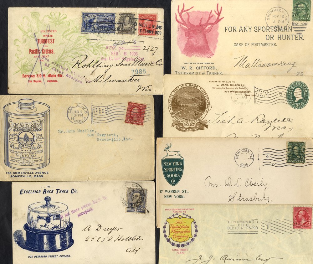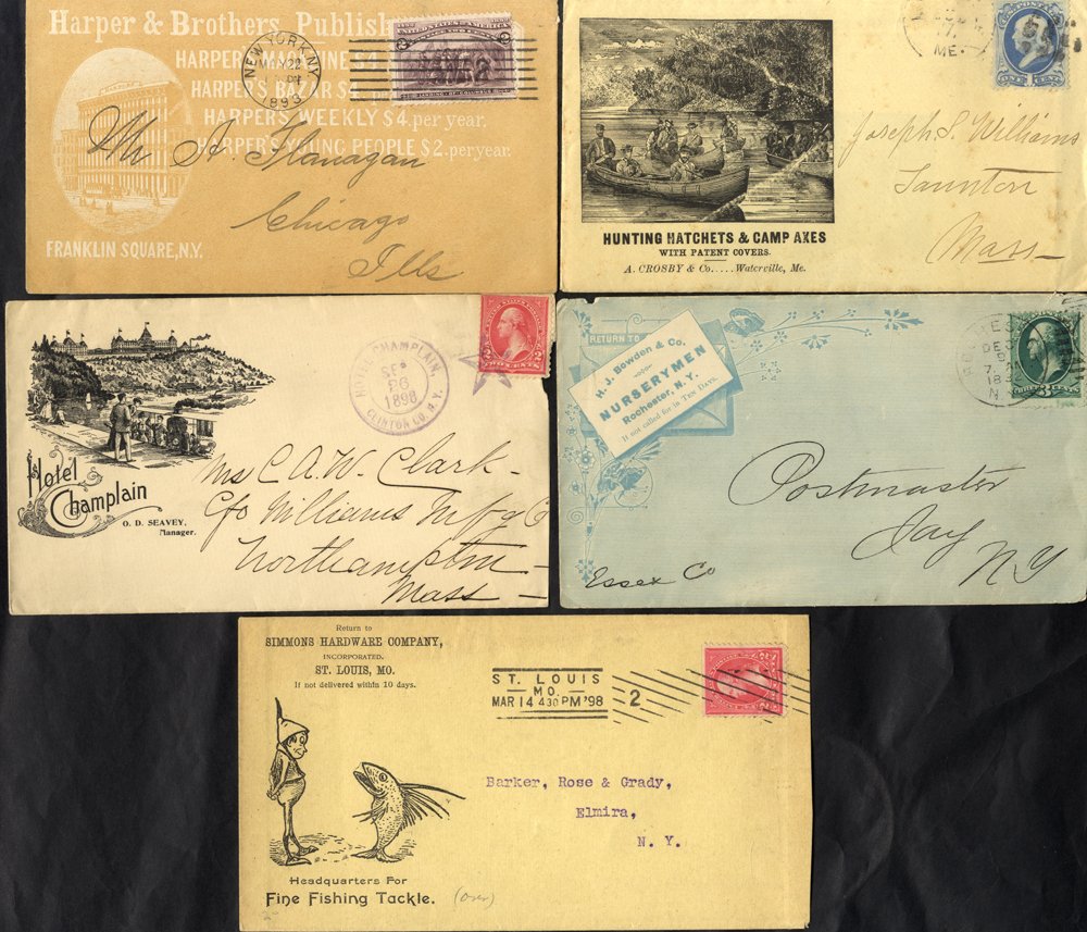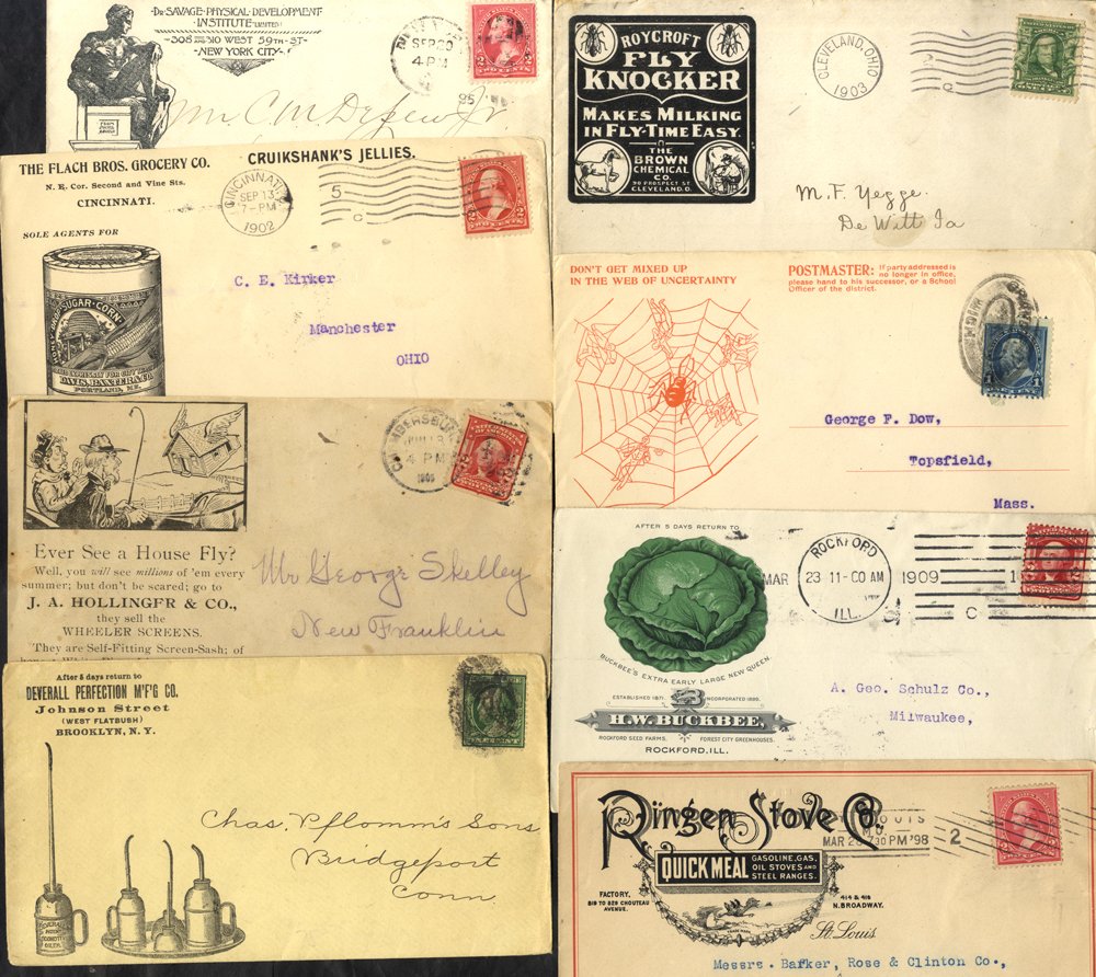 ADVERTISING MAIL c1890's-1910 range of covers (31) which bear printed commercial advertising illustrations incl. The United States Playing Card Company, New York Sporting goods Co, Hotel Champlain, Frictionless - The Metal that never fails, Cedarmist Insect Exterminator, Honey Drop Sugar Corn, Roycroft Fly Knocker.