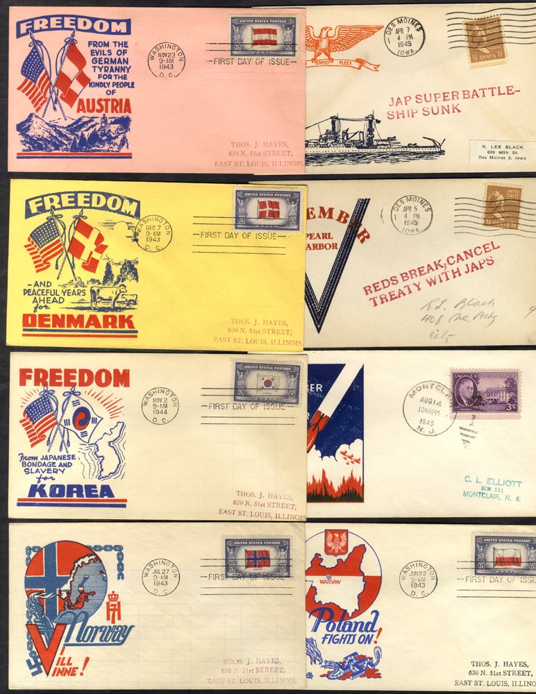 1920's-40's covers (70+) incl. many first flight cacheted types, World War II, Propaganda illustrated types 'Poland Flights on', 'Remember Pearl Harbour', Japan Super Battle Ship Sunk, Yanks enter Hannover & Bremen', 'Berlin falls to Red - Italy freed etc.